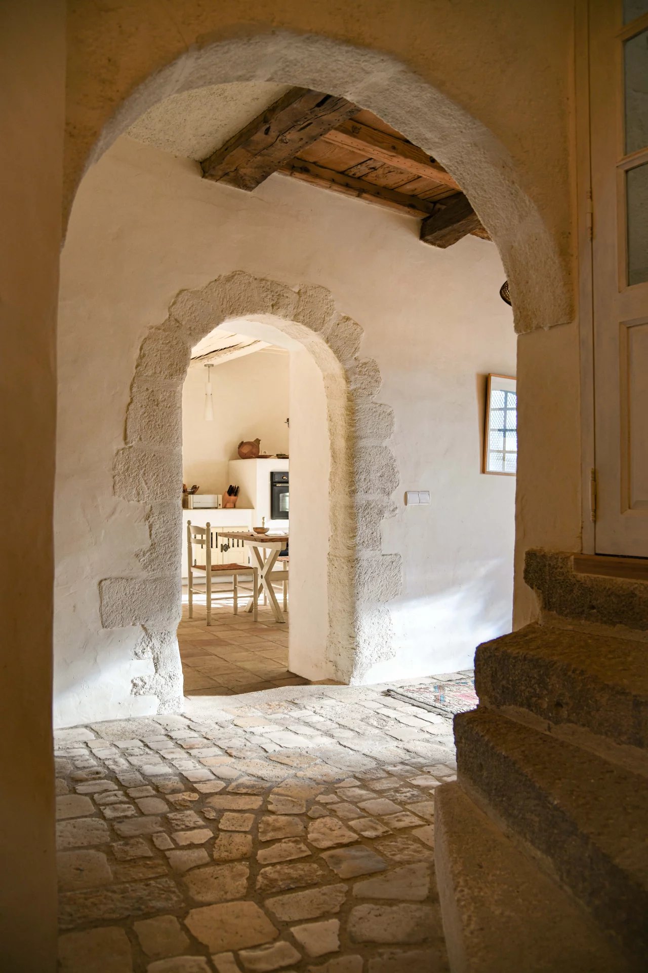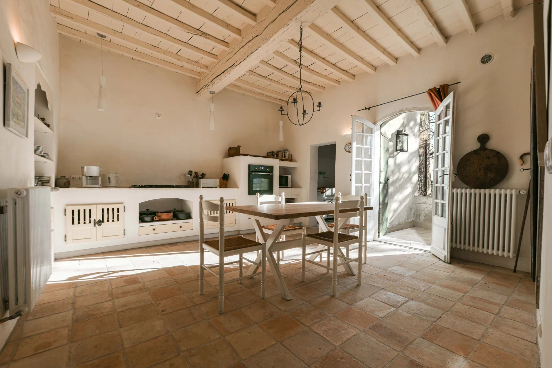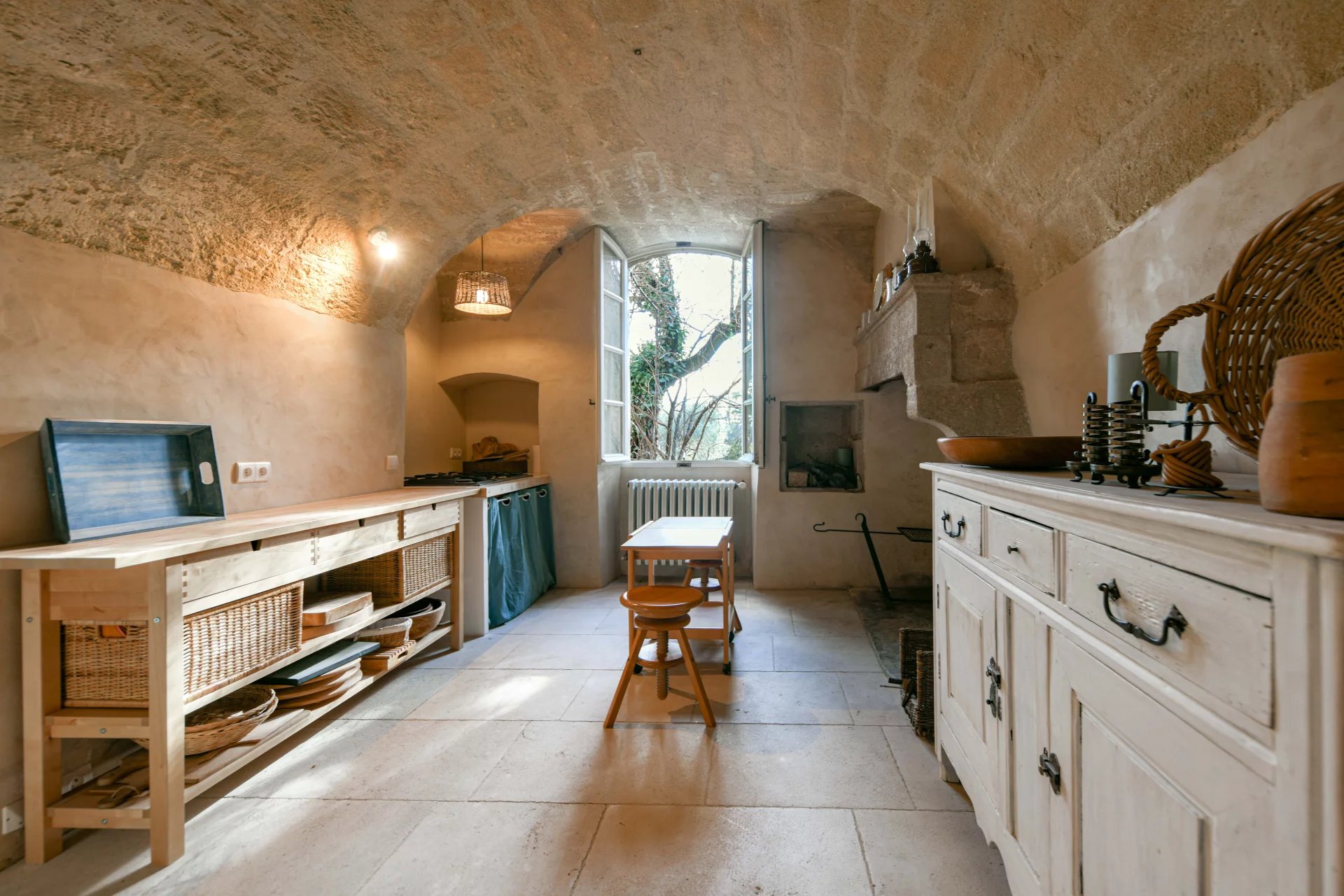 The majestic entrance hall opens onto the garden. It leads seamlessly into an intimate sitting room adorned with fine stone vaults and a vestibule with a powder room. On the garden side, there is a spacious 26 m2 dining room with a beautiful decorative fireplace and a summer kitchen, a living room featuring a barrel vault and period fireplace.