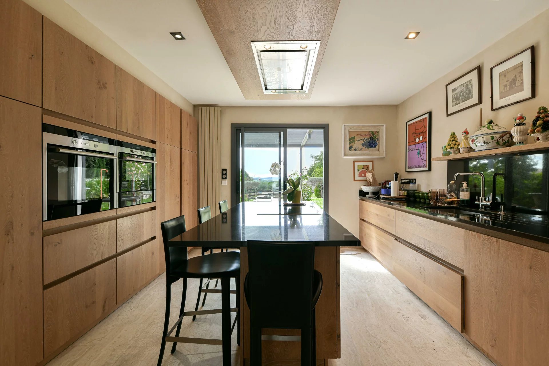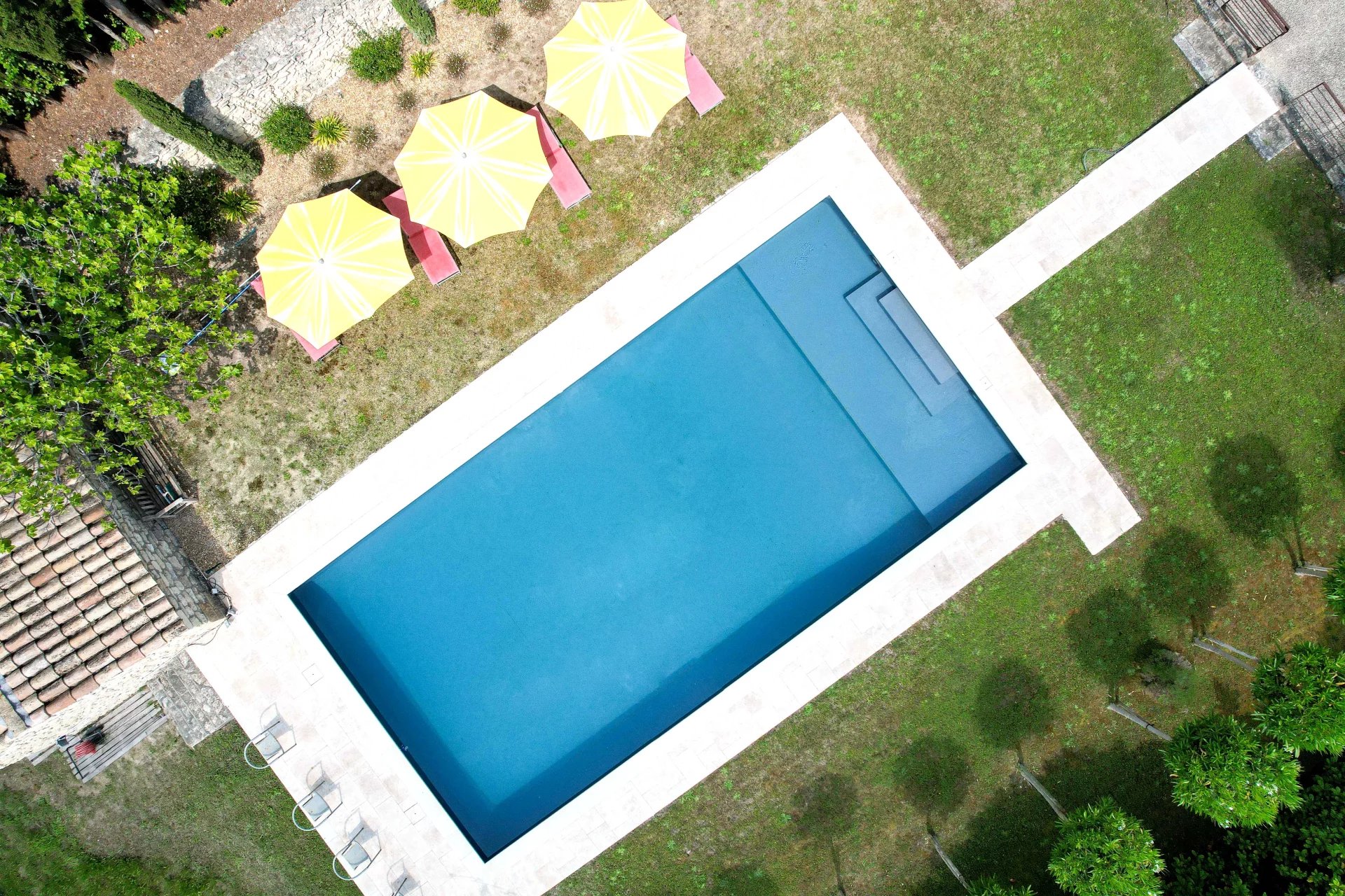The entrance hall leads seamlessly into the living rooms. As soon as you enter, the view through the bay window in the kitchen is breathtaking: the swimming pool, the garden, the olive grove, the countryside and the Cevennes in the distance. To the left, the large living room (49 m2) enjoys triple exposure and opens out onto the bio-climate terrace, with its infinite views. The adjacent kitchen has plenty of storage space, stone worktops (Zimbabwe granite worktops) and also opens onto the terrace (adjoining cellar). The hallway then leads to the property’s bedrooms: the master suite spreads over 41 m2 and offers a beautiful bedroom with large storage cupboards, combined with a bathroom (double washbasin, walk-in shower and separate toilet) and a study, cleverly nestled in a veranda that opens onto both the bedroom and the garden. Two further bedrooms, each with its own bathroom, open onto a private terrace to the east (each measuring 19 and 21 m2). Finally, a children’s bedroom with a small shower room completes the sleeping area. Guest toilet.