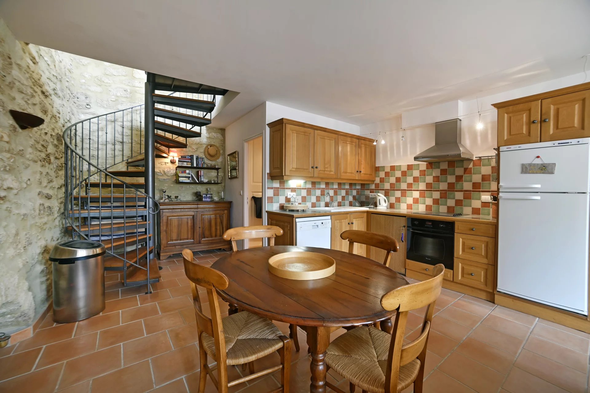 A duplex apartment on the first level, comprising a bright living area with a kitchen/dining area, a bedroom and a bathroom.