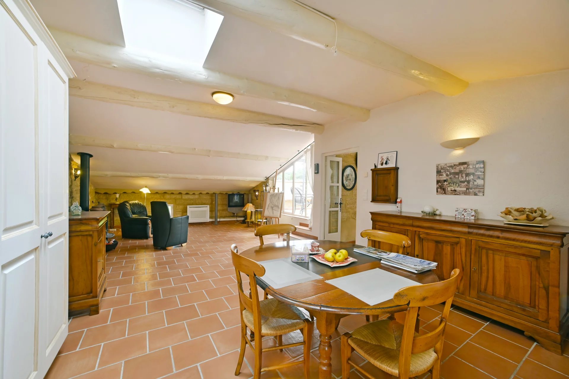 A third flat comprising a living area opening onto a south-facing terrace, kitchen/dining area, bedroom and bathroom.
