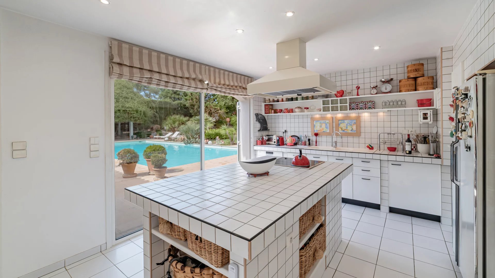 It is set on a large, beautifully landscaped plot, with a particularly well-kept outdoor area around the swimming pool. The vast pool, forms the centerpiece of the garden. It is surrounded by decorative vegetation and flower beds, including agapanthus, creating a very aesthetic and pleasant living environment.