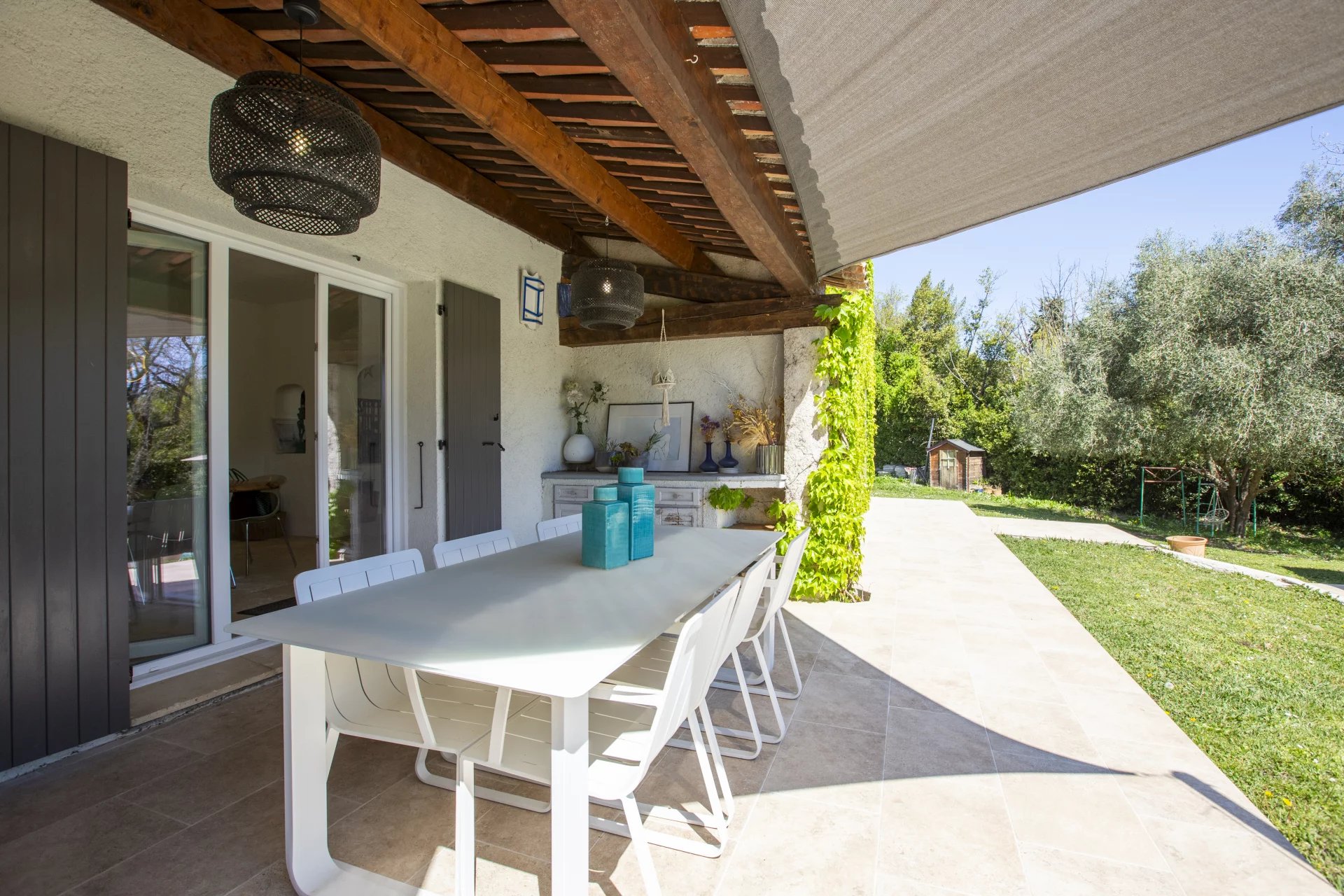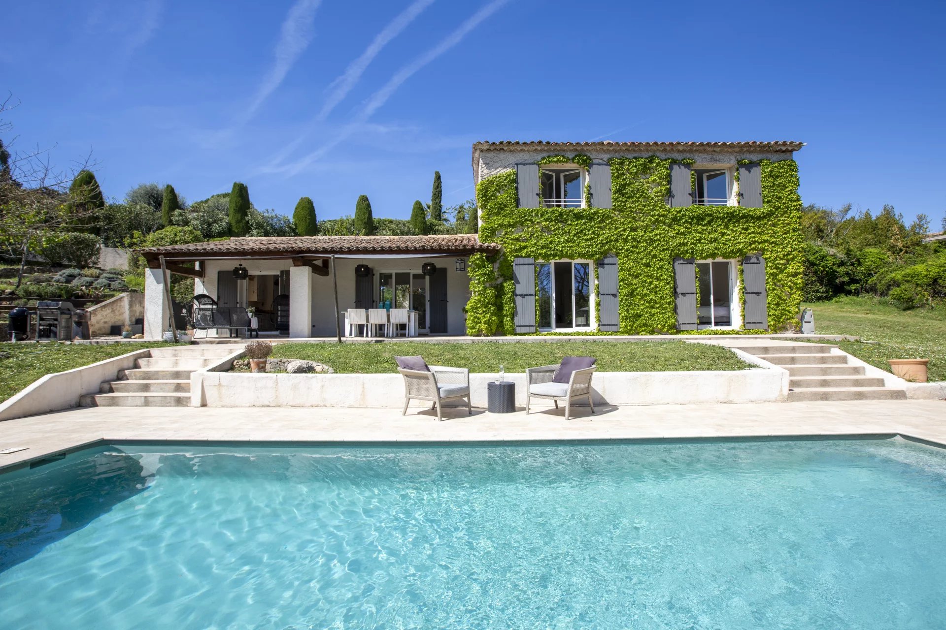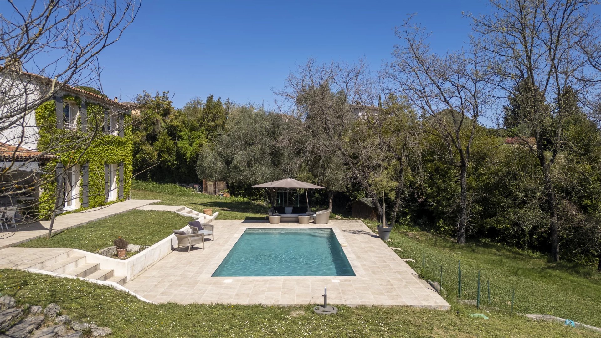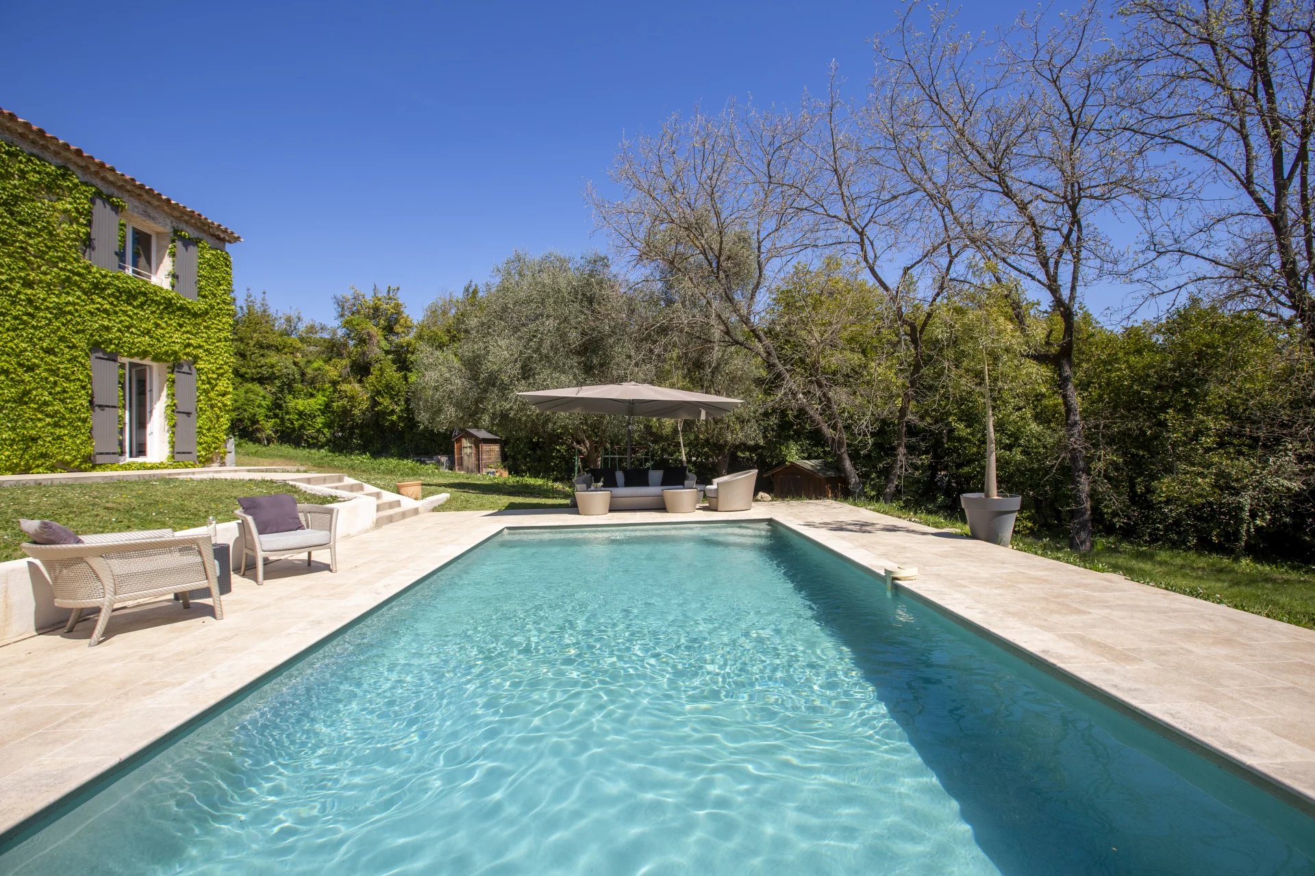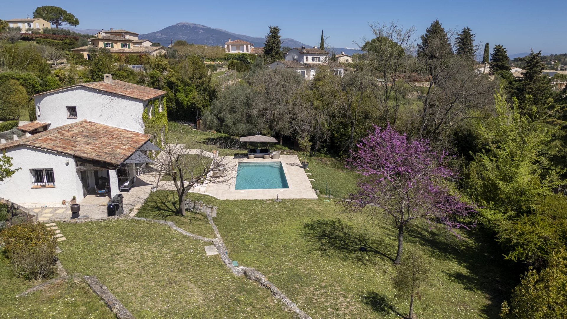 Lovely family home only a short walk from Valbonne village. The villa sits on a large, quiet garden in a gated domaine.