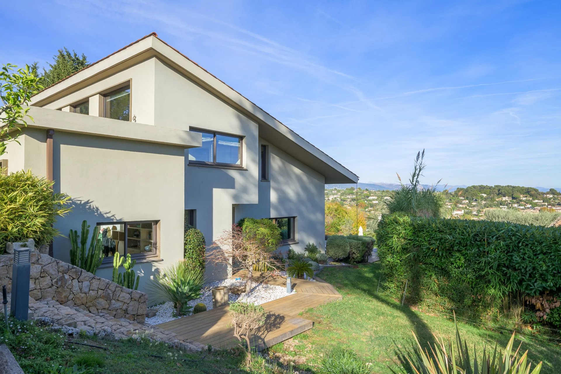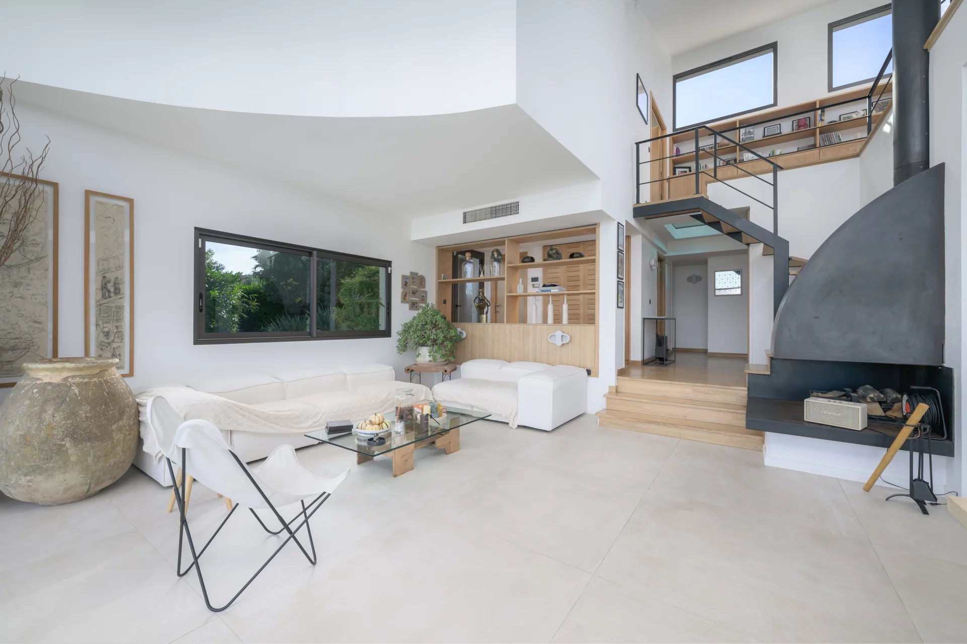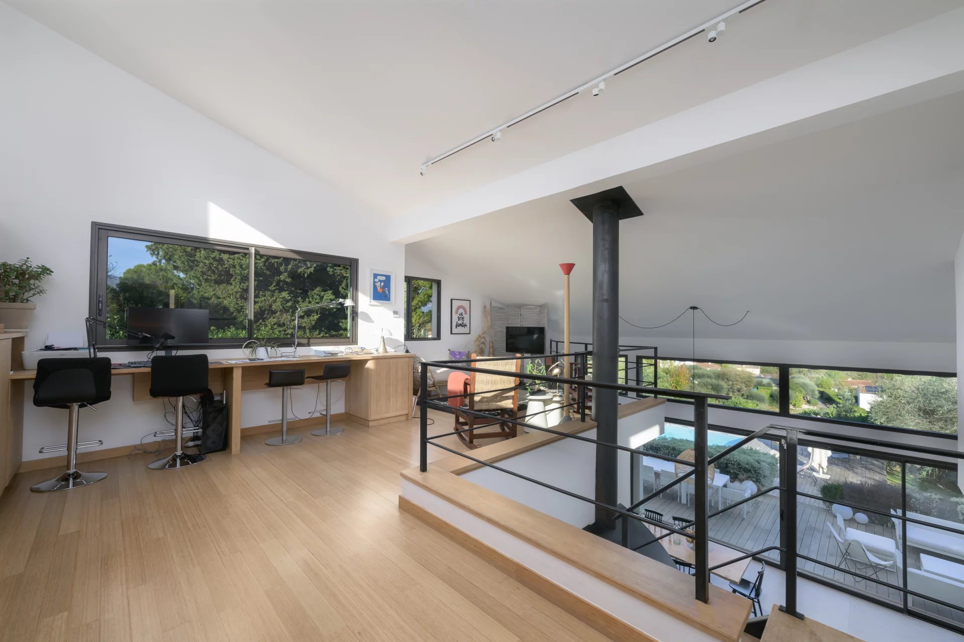Approx. 15 min. walk from the village, in a dominant position in absolute peace and quiet, with stunning panoramic views of the village, hills and mountains, this superb contemporary home is extremely bright with high loft-style ceilings, and opens out onto the terraces and garden through imposing bay windows.