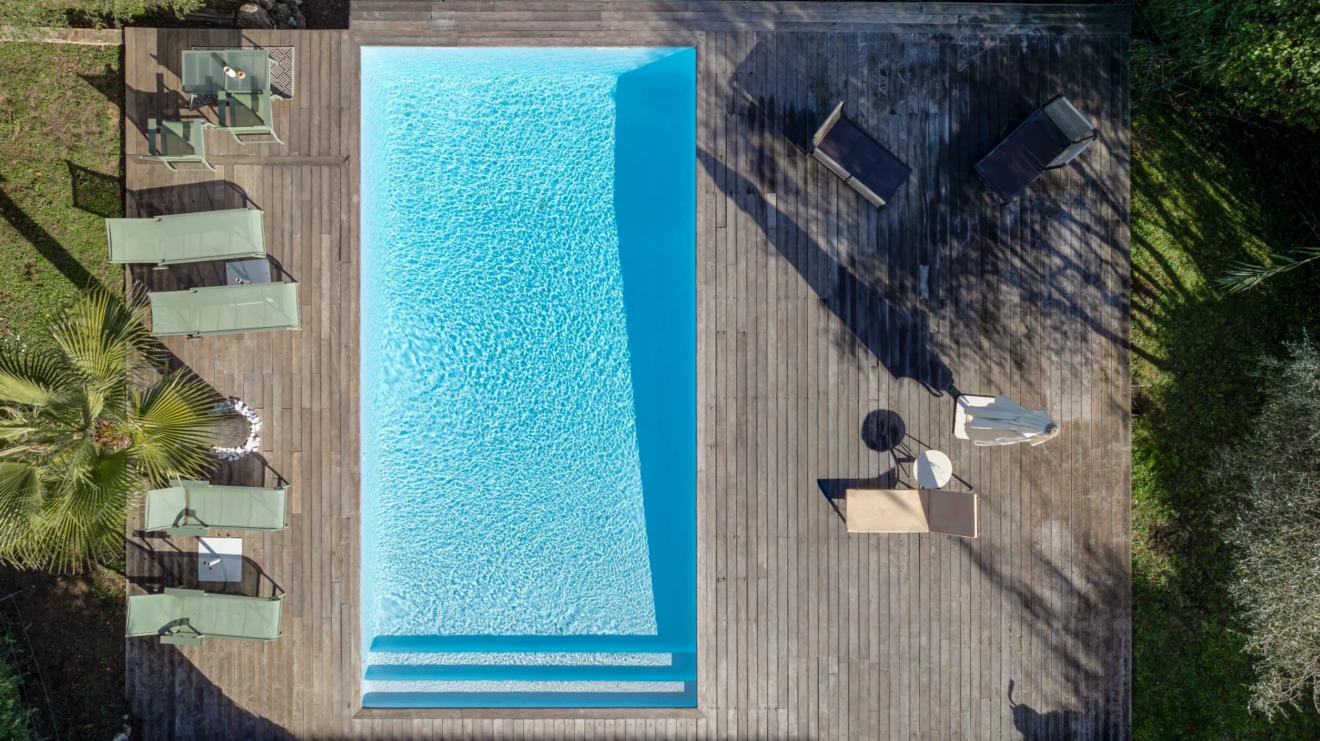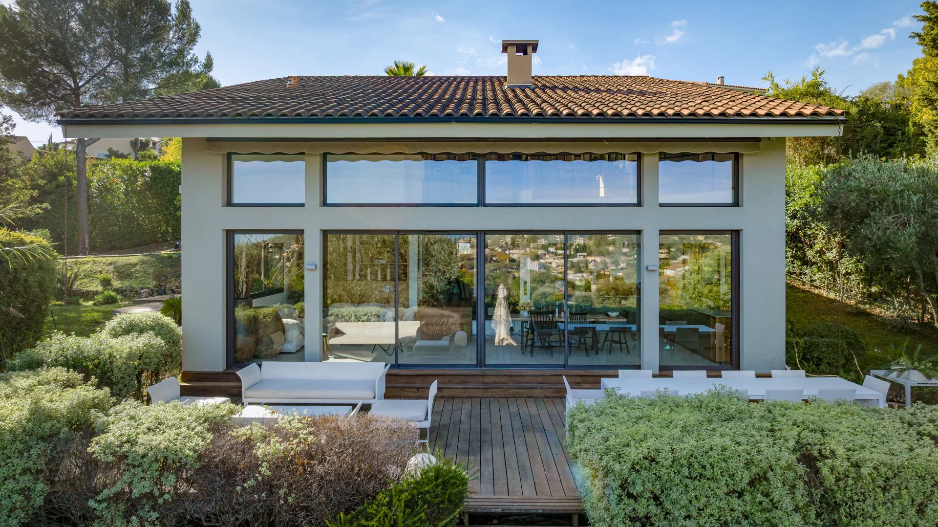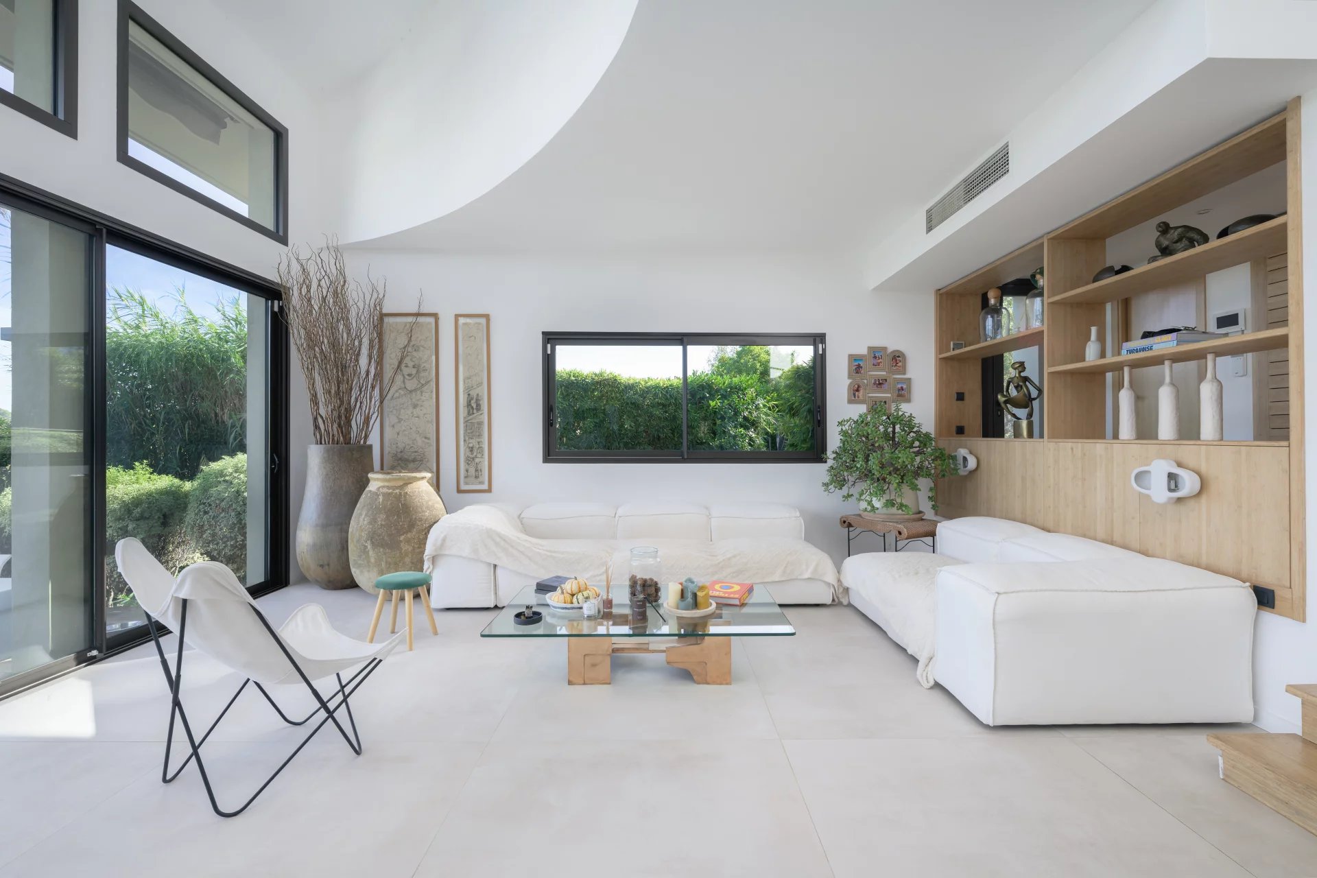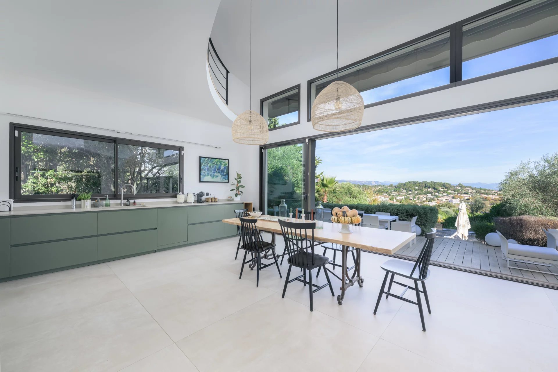 Approx. 15 min. walk from the village, in a dominant position in absolute peace and quiet, with stunning panoramic views of the village, hills and mountains, this superb contemporary home is extremely bright with high loft-style ceilings, and opens out onto the terraces and garden through imposing bay windows.