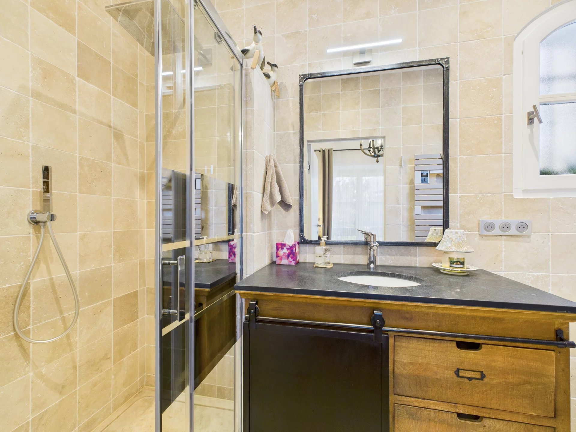 The ground floor boasts a spacious living room with a fireplace and a separate, fully equipped kitchen with a central island, both opening directly onto the terrace and pool area. This level also includes a guest bedroom with its own shower room and toilet, as well as a practical laundry room.
