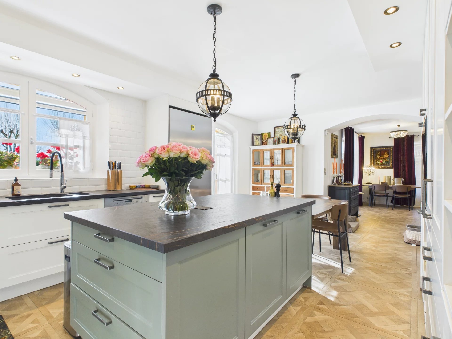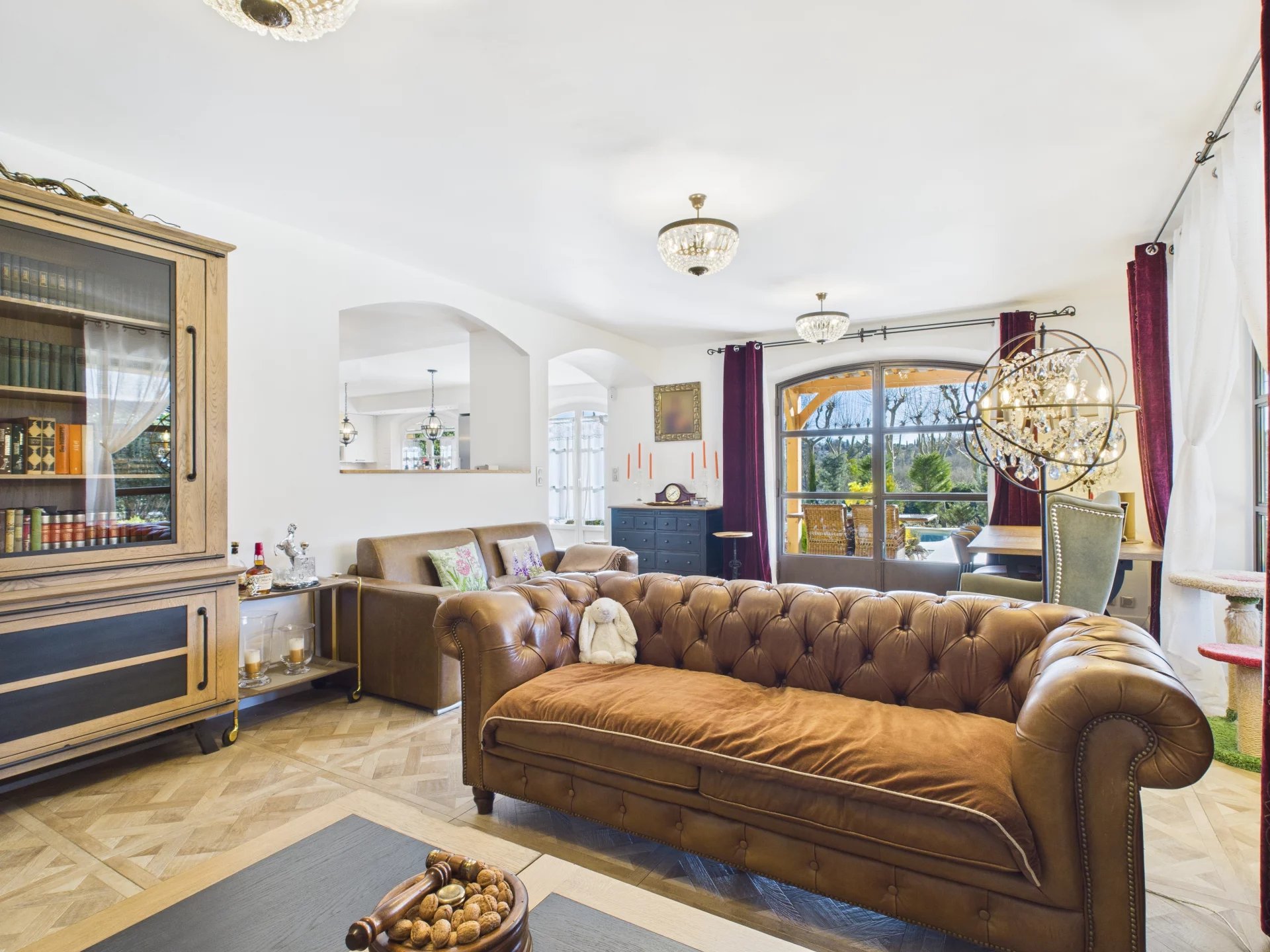 Outdoors, the south-facing terrace overlooks the swimming pool and lush garden, offering several inviting seating areas ideal for relaxation and entertaining. A double garage and additional parking for five to six cars complete this exceptional property.