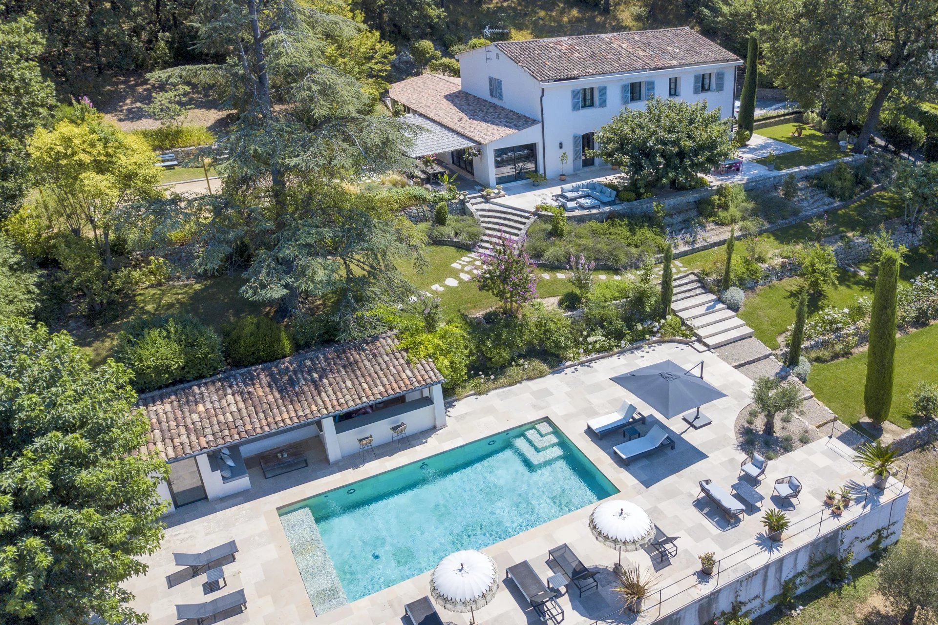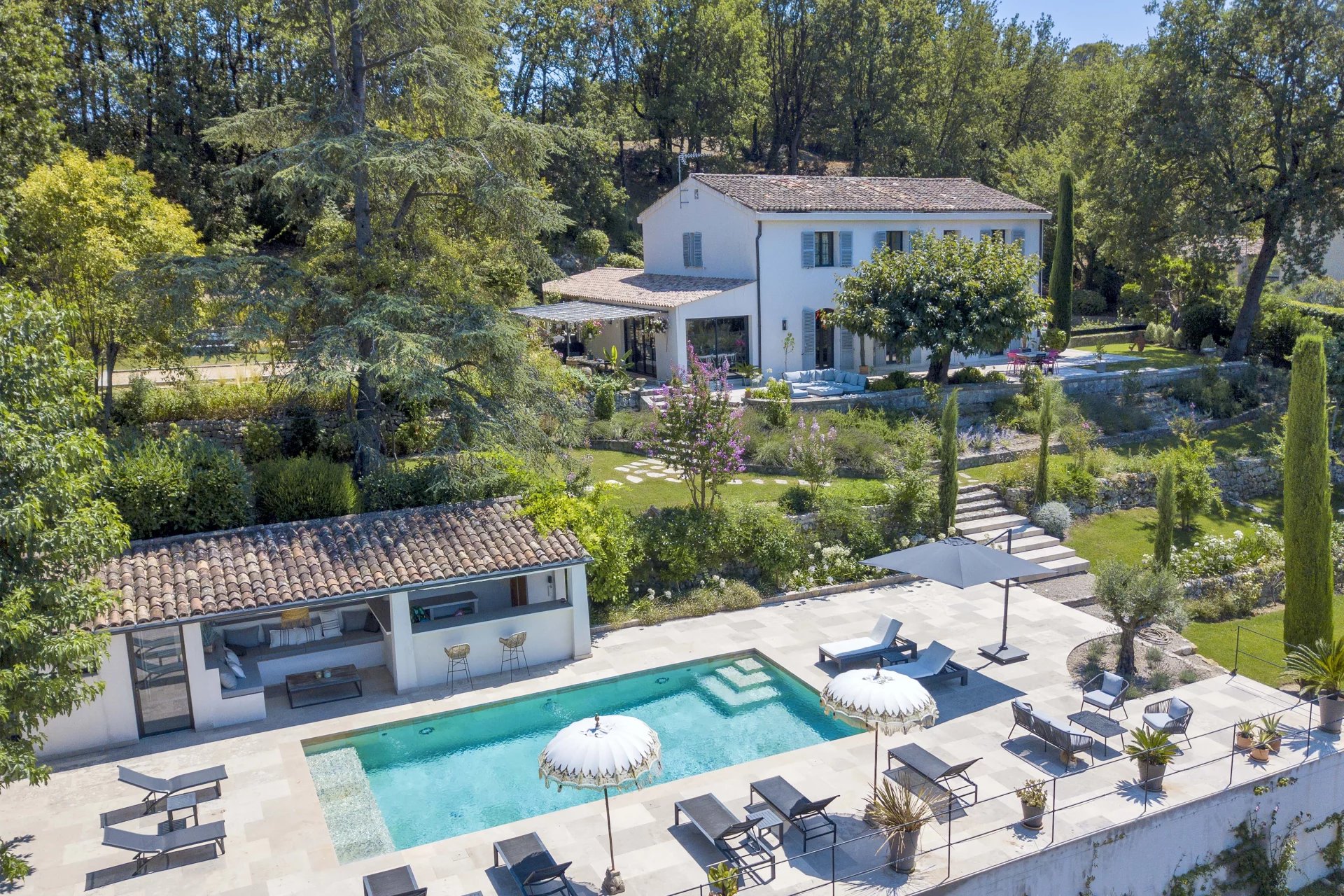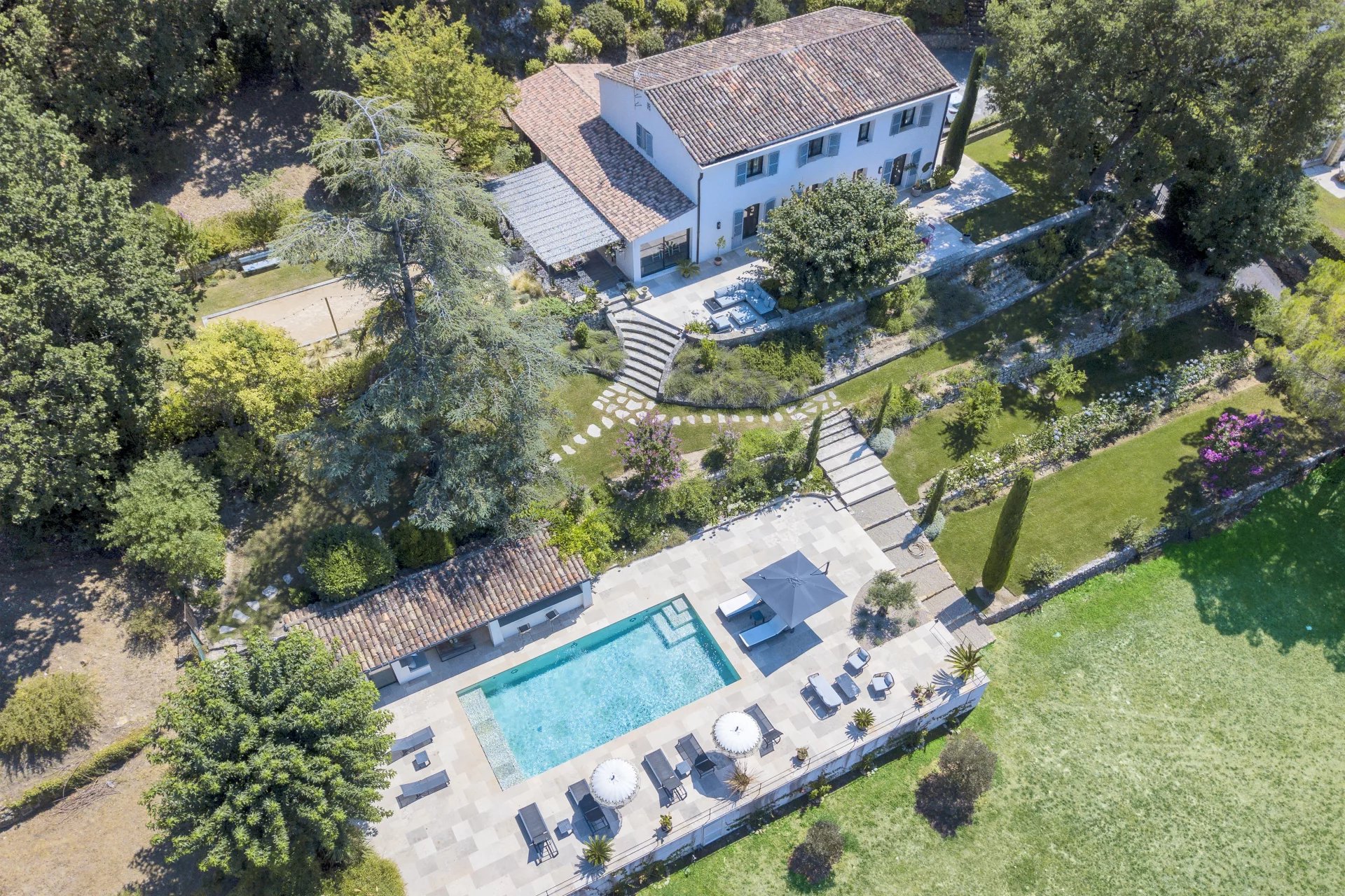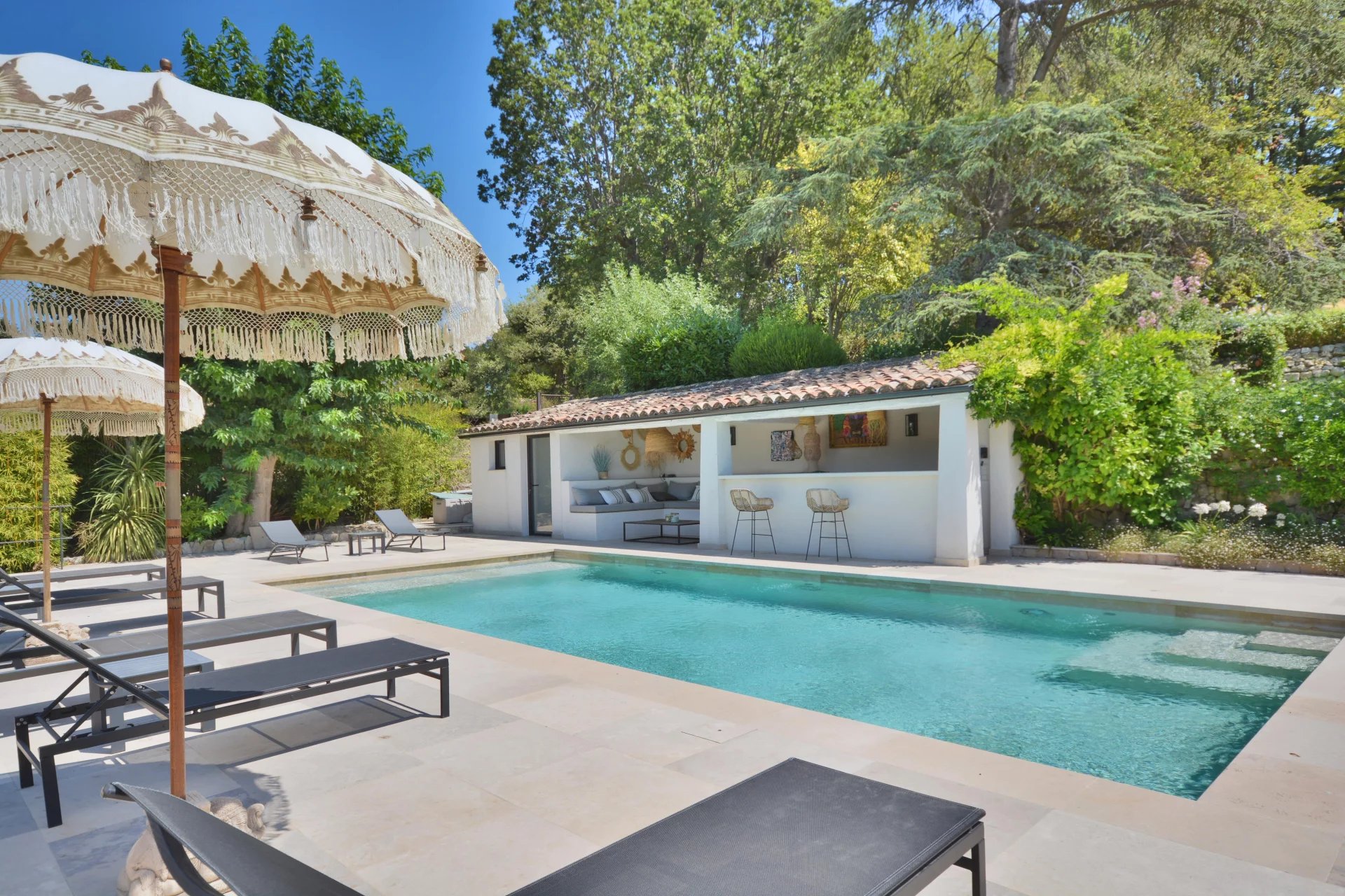 Landscaped park of 5000 m2 adorned with a lovely heated pool, large flagstone sun bathing areas, pool house and petanque court. Parking facilities for your family and your guests.