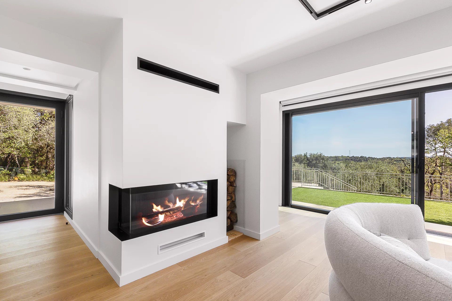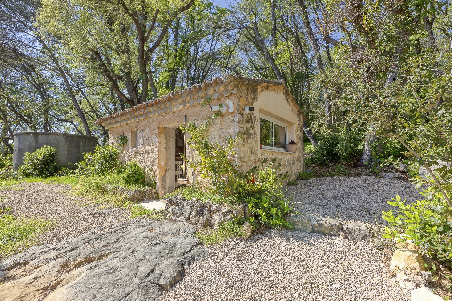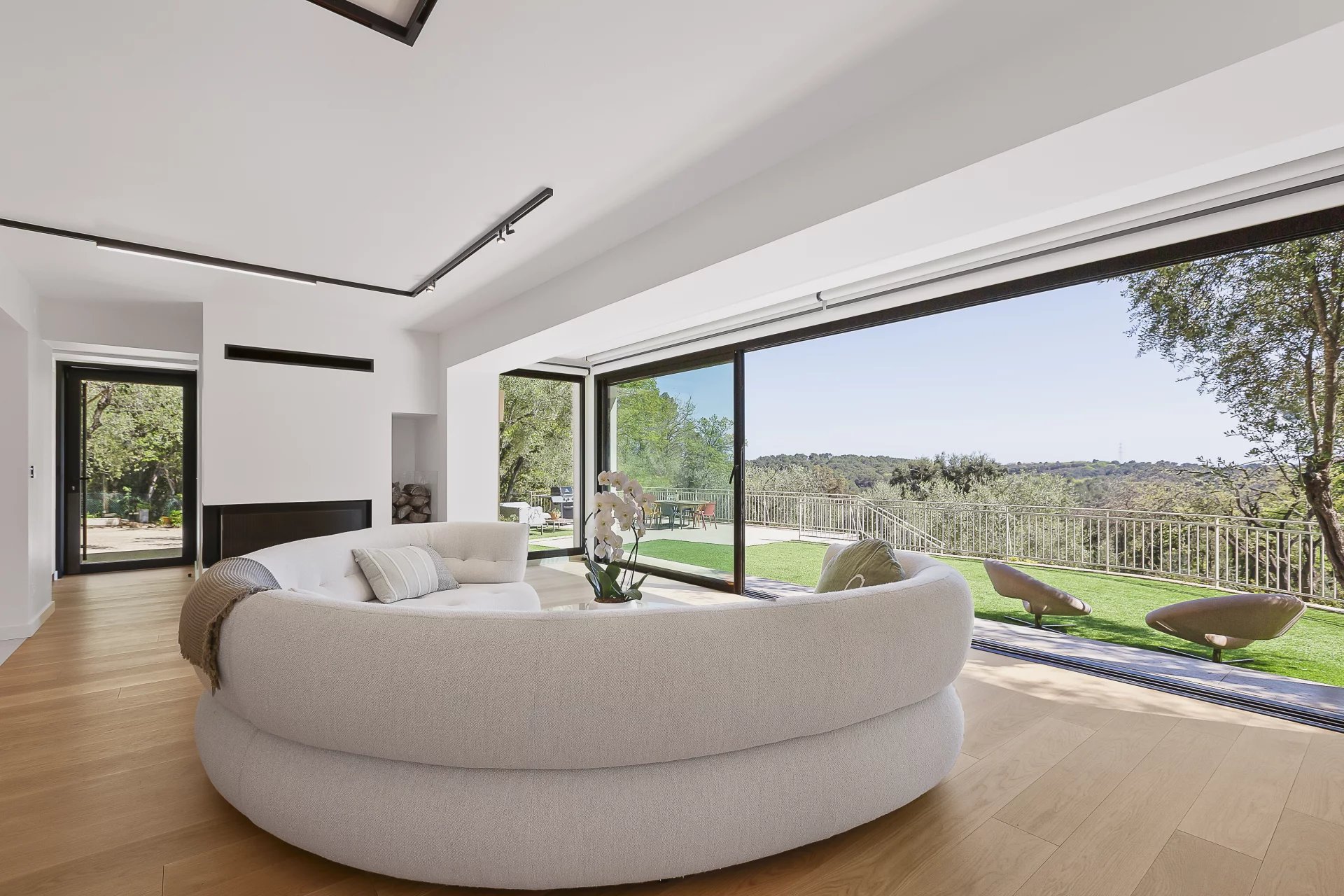 190 m2 south facing renovated villa in a dominated position of its 4800 m2 garden filled with fruit trees, olive trees and historical oaks with a view over the endless forest. Air conditioning and heated floors in all rooms.