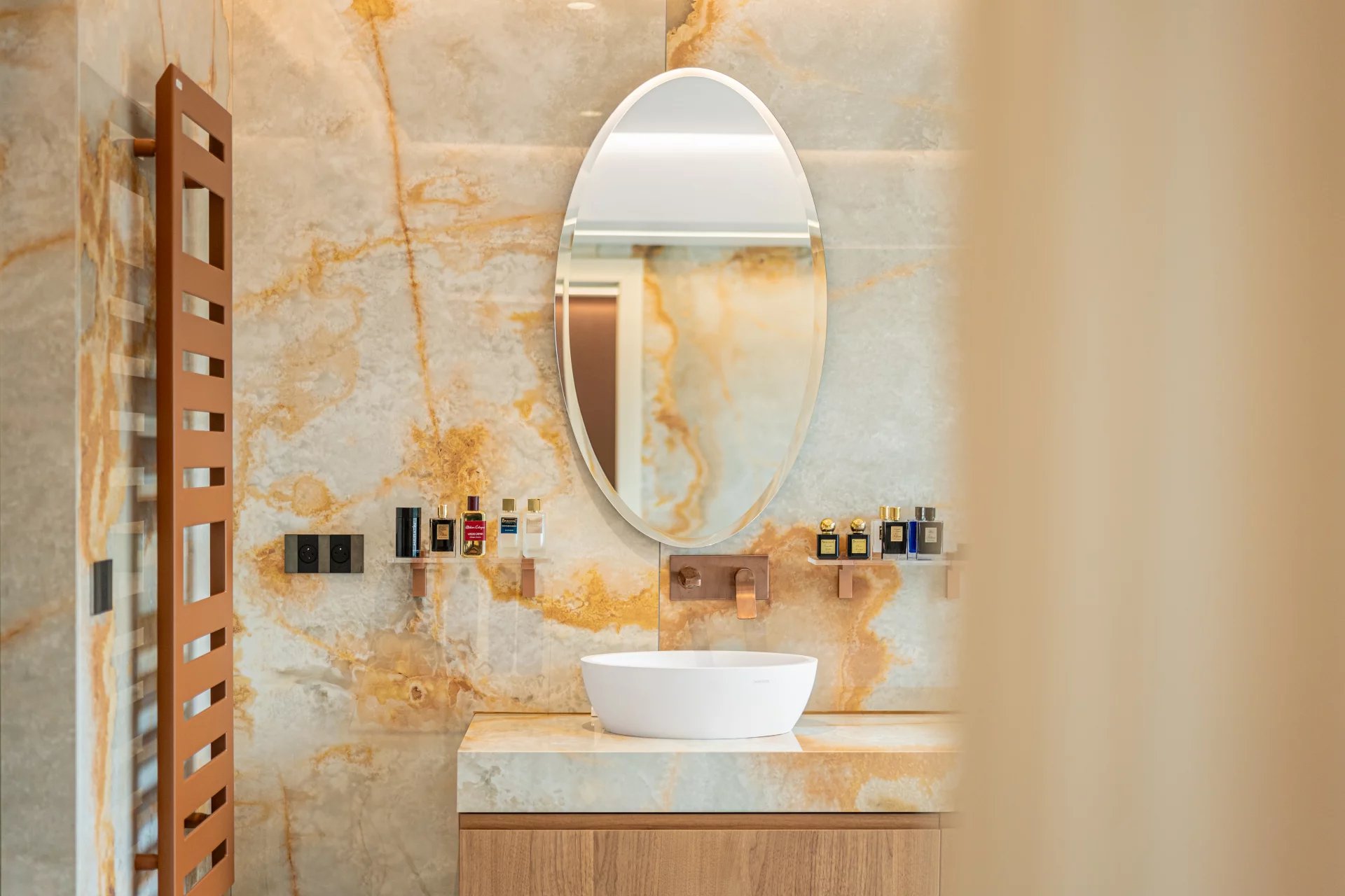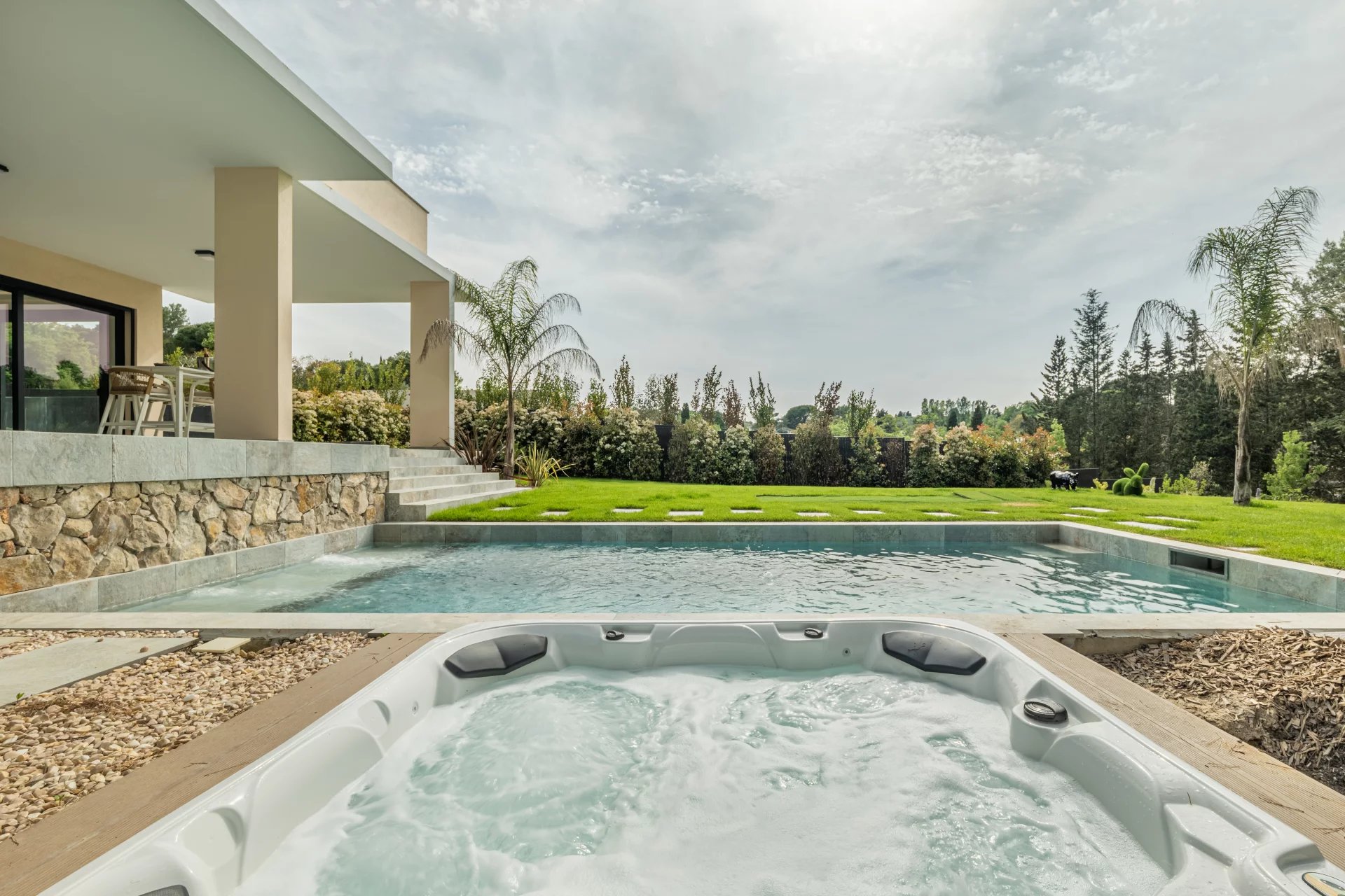 Upon entering, you are welcomed by a light-filled living and dining area with an open-plan, high-end kitchen. Large sliding doors create a seamless transition between the stylish interior and the spacious, covered terrace, revealing a stunning view of the pool and Jacuzzi.