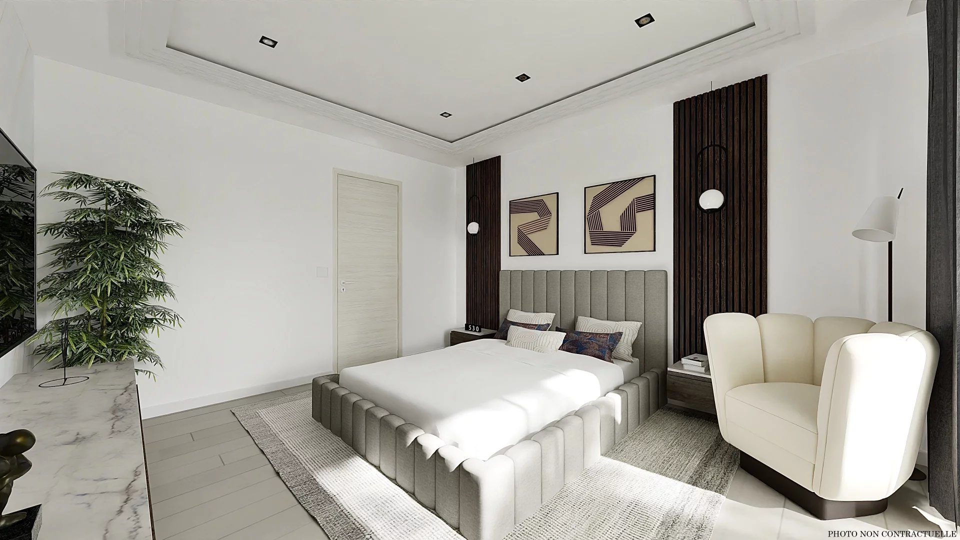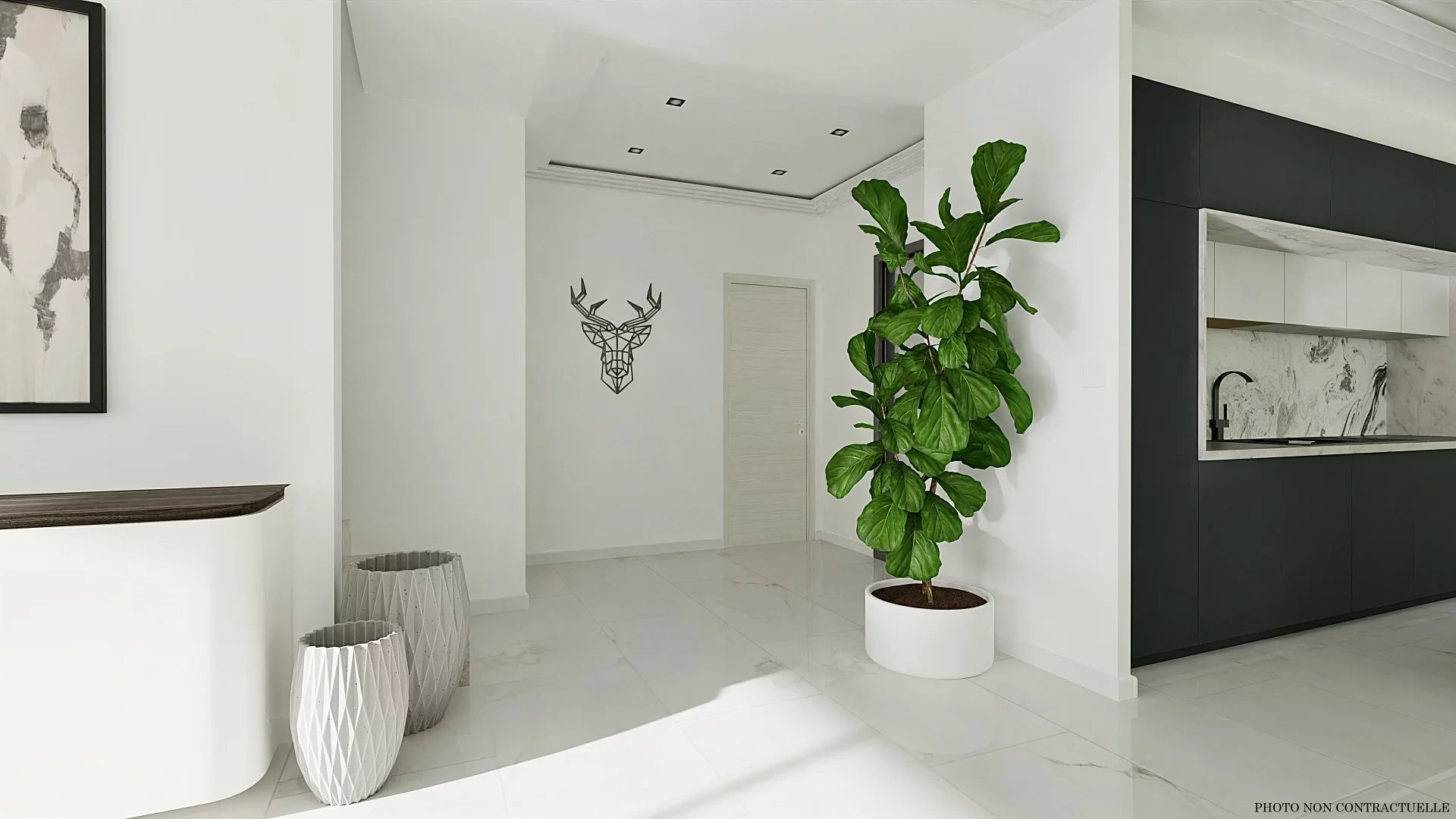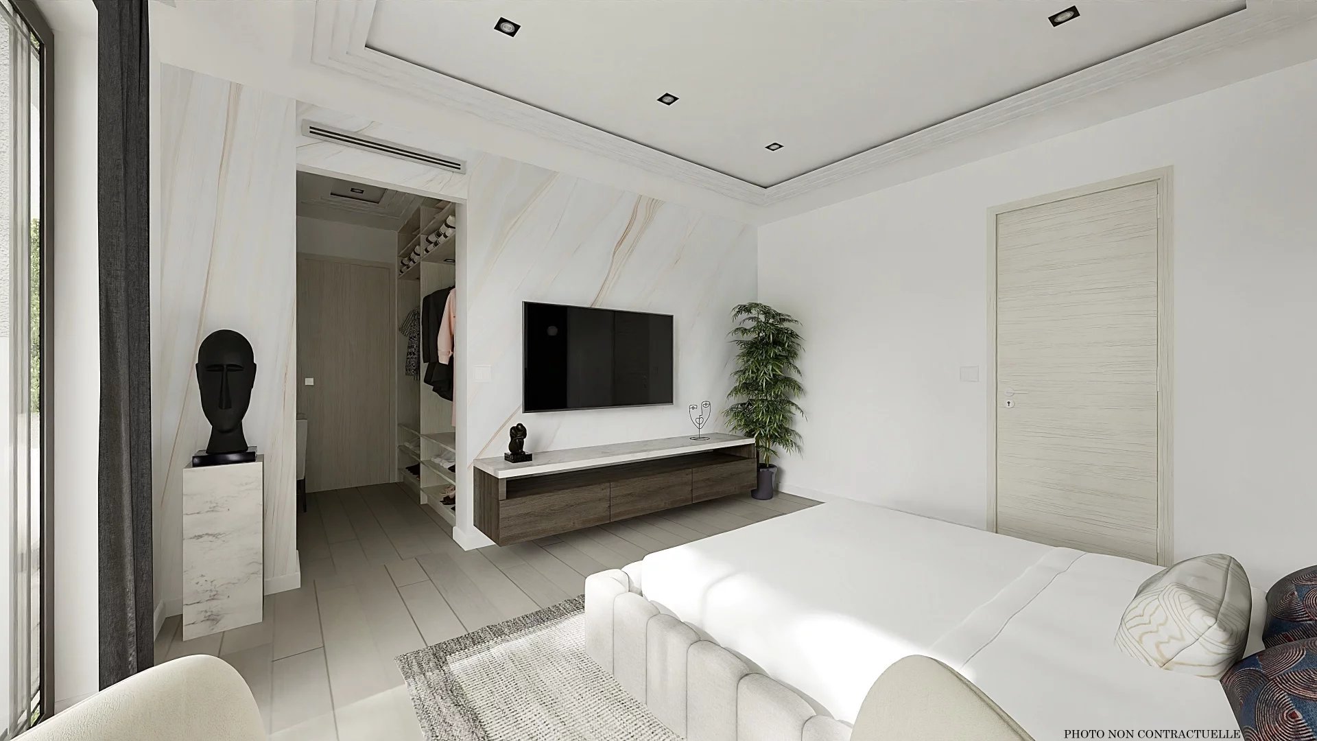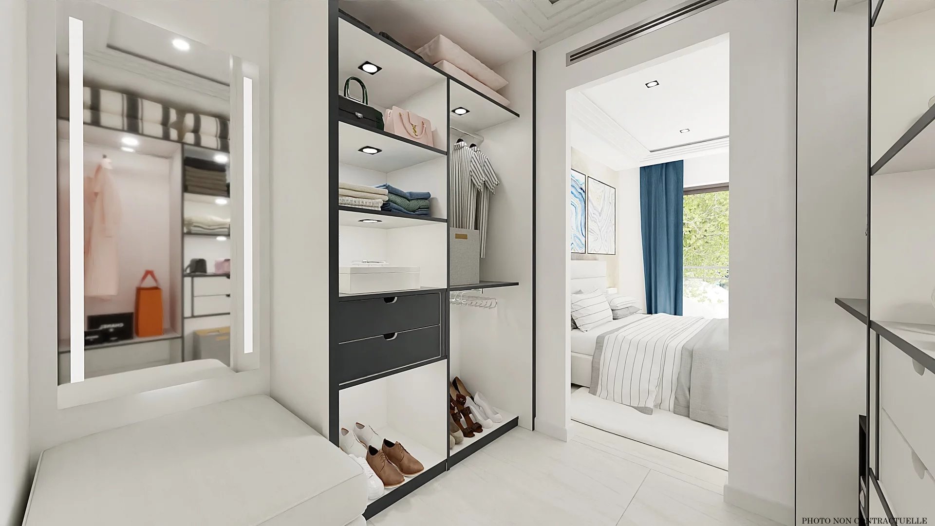 Large reception area of 70m2, living room, dining room, open kitchen, bedroom with dressing room, bathroom and toilet.