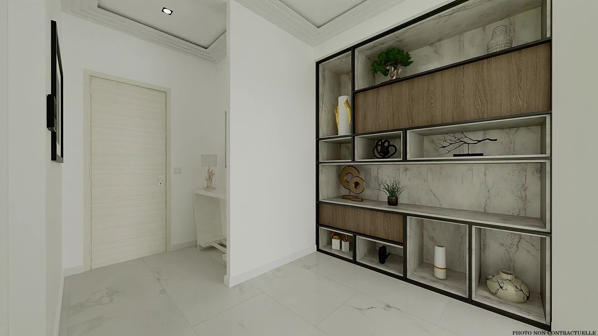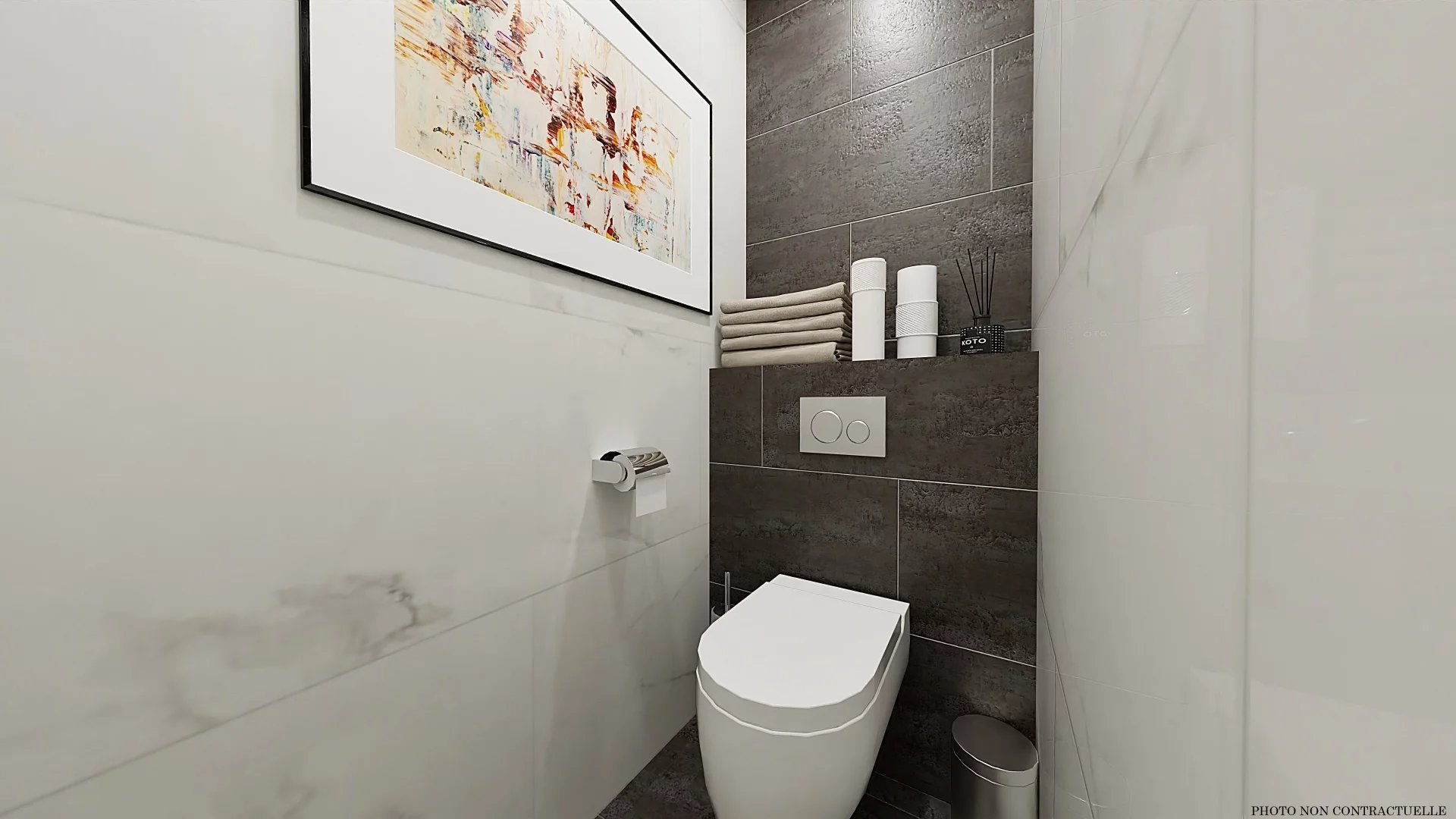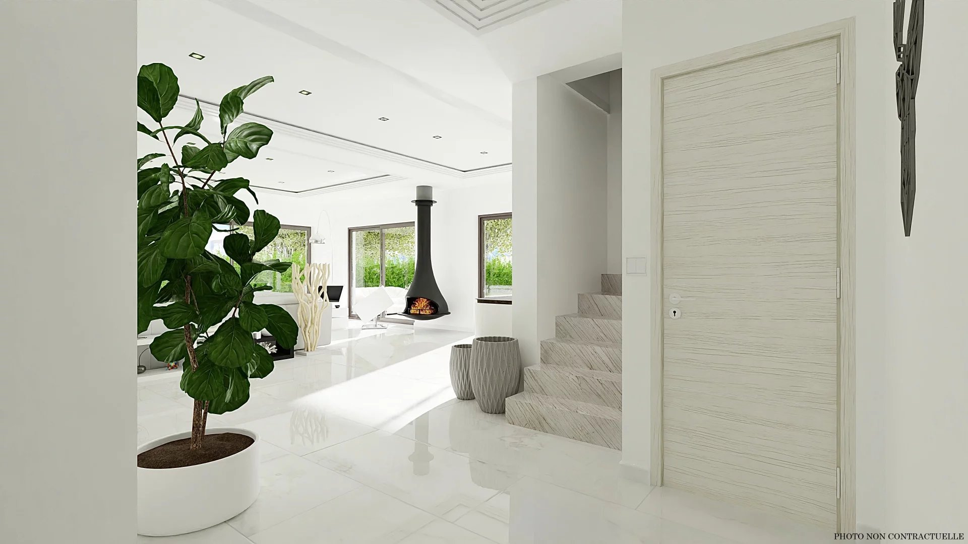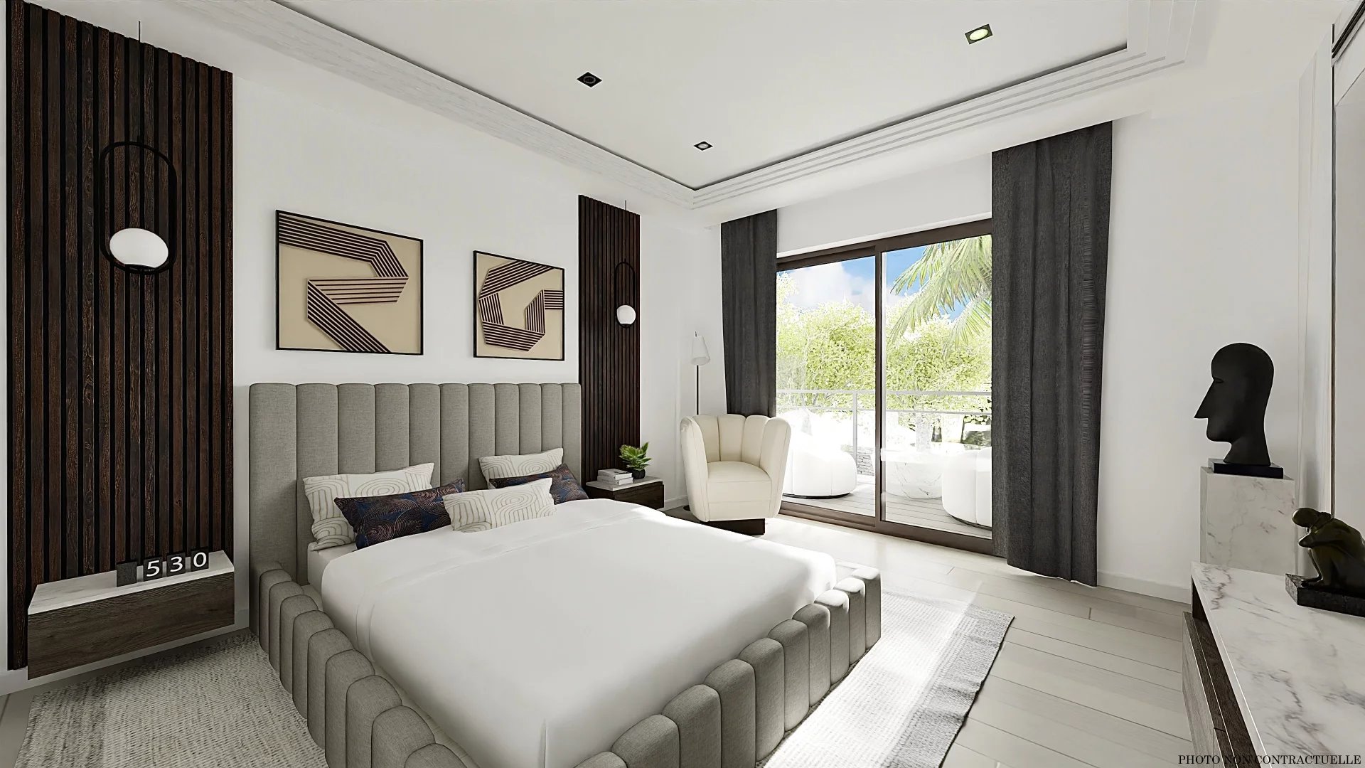 Large reception area of 70m2, living room, dining room, open kitchen, bedroom with dressing room, bathroom and toilet.