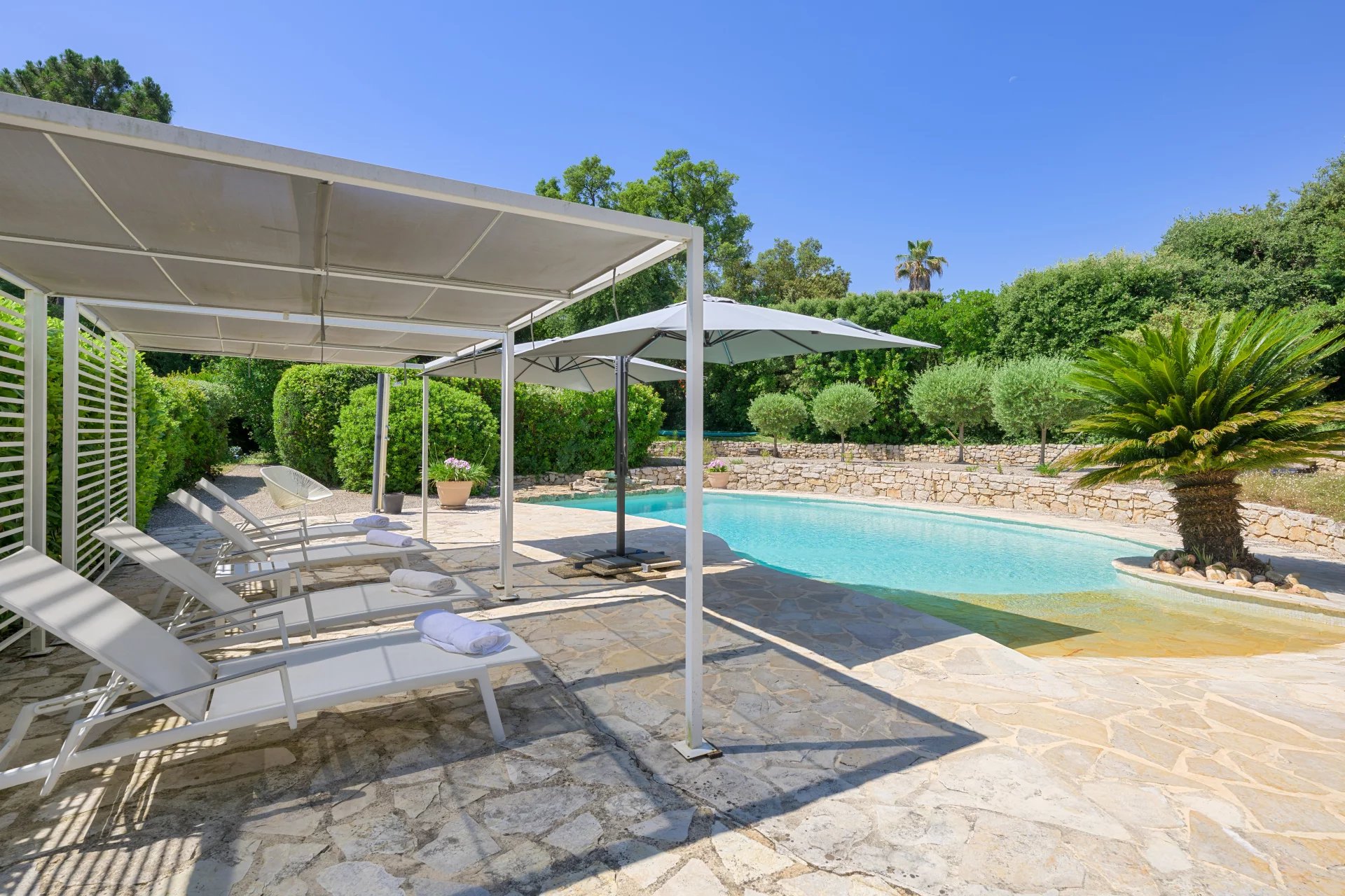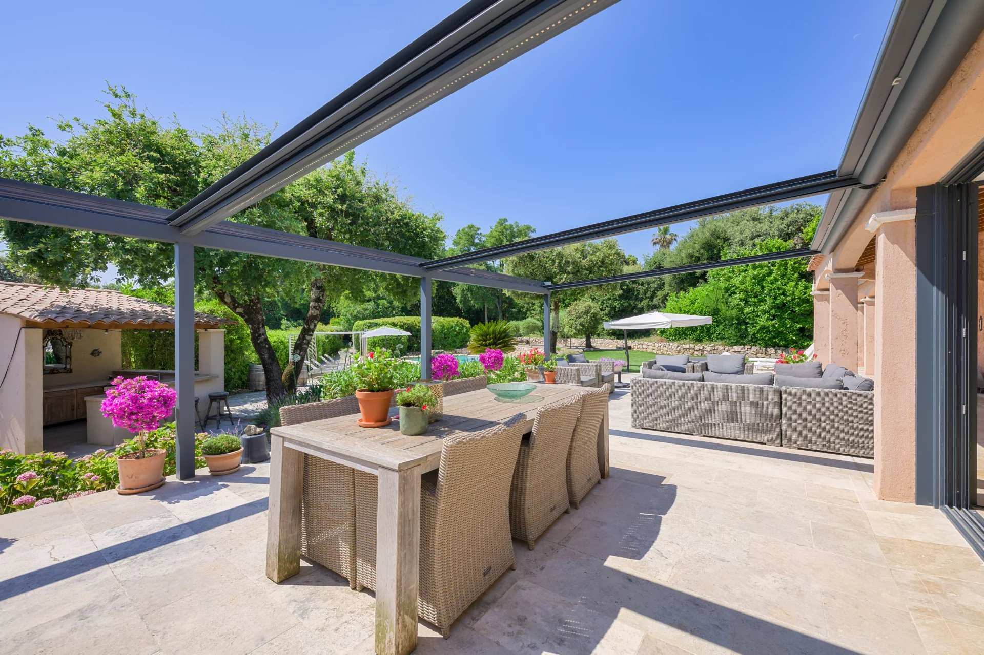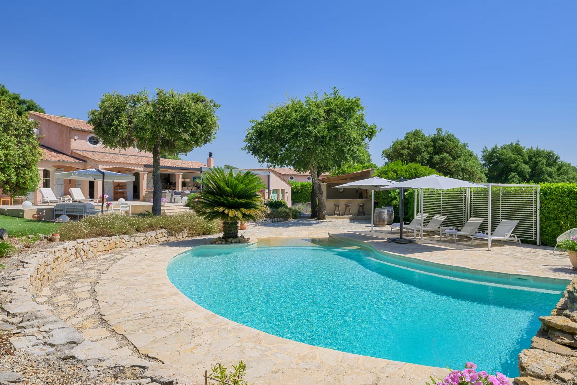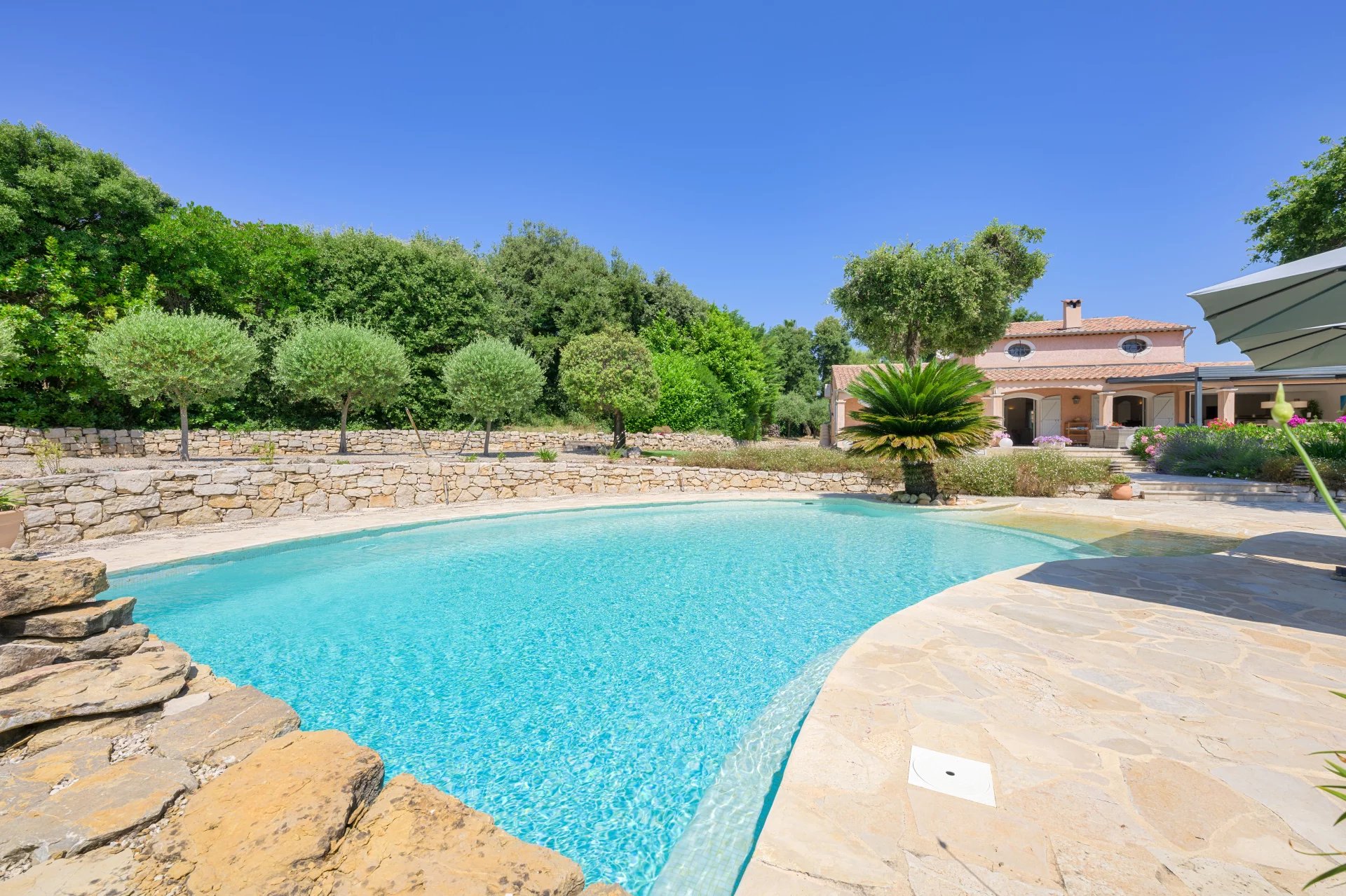 Several sun-drenched terraces are perfect for enjoying warm days. A pool house complements the large heated swimming pool, perfectly integrated into the landscape.