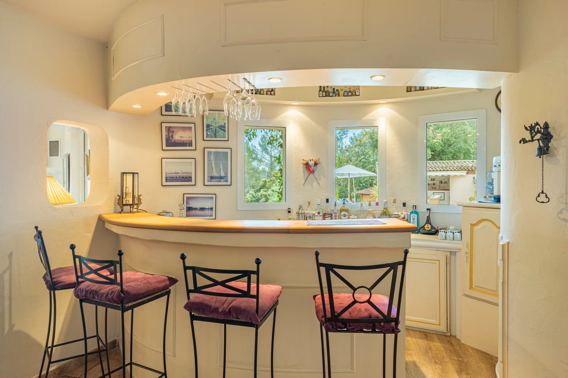 Divided across three levels large open plan living room with high ceilings, with large windows and fireplace, a cosy bar and dining area with vaulted ceiling . Recently renovated well equipped kitchen, complete with dining area . Each room on this level opens on to terraces, both shaded and sun soaked, around the swimming pool .