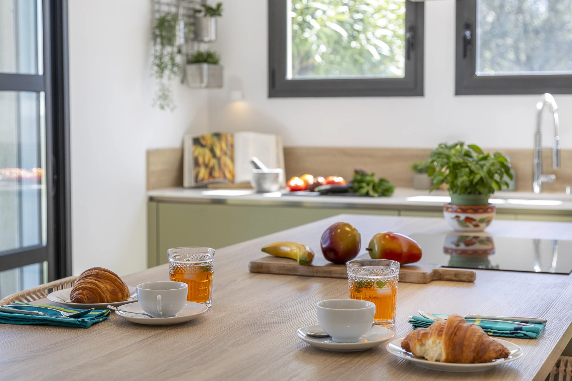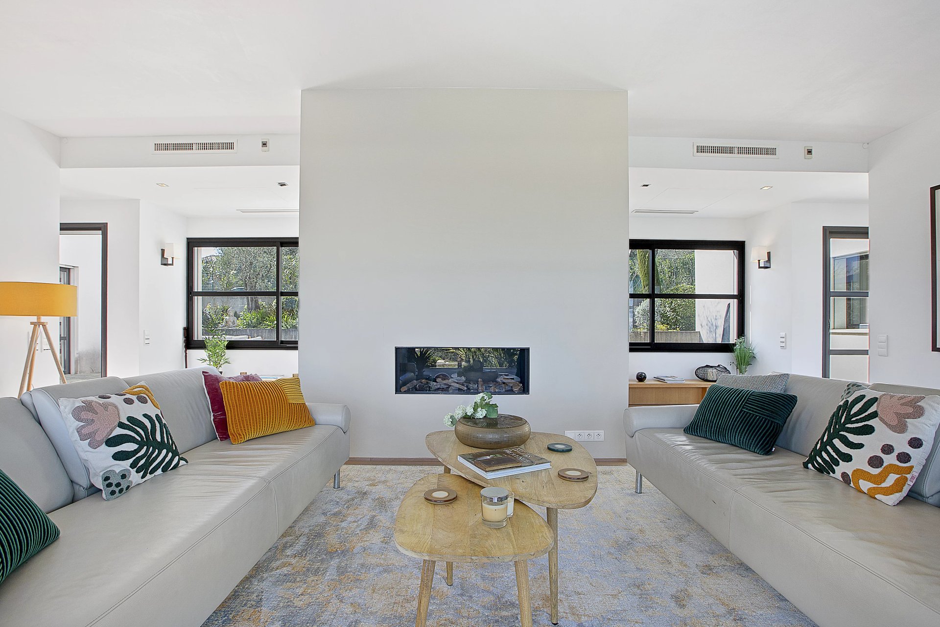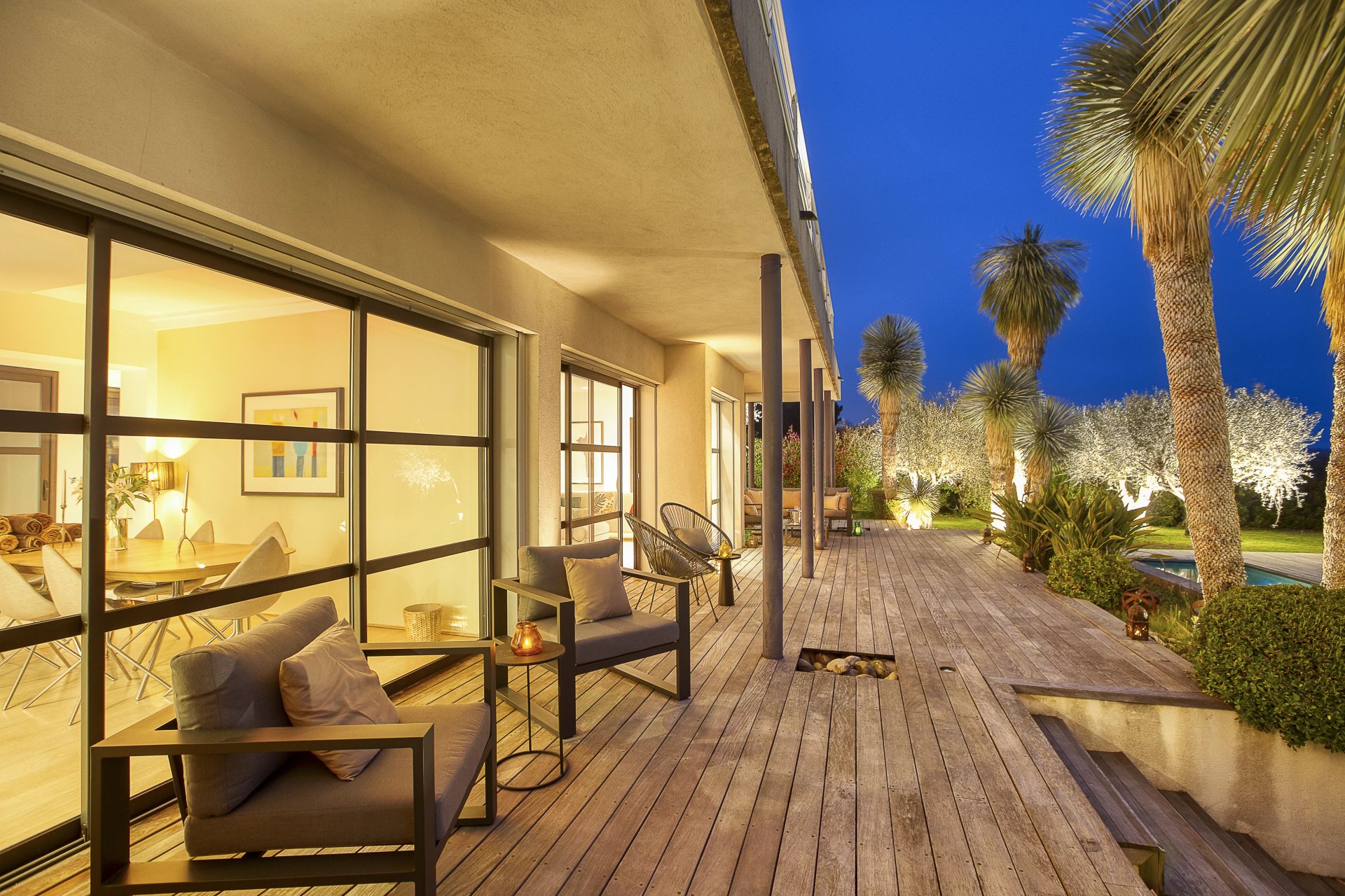 Designed to maximise natural light and indoor-outdoor living, the villa features generous reception spaces with large bay windows opening onto a spacious wooden terrace overlooking the garden and swimming pool. The main living area includes a living room with fireplace, dining room and a modern fully equipped kitchen, all enjoying unobstructed views.