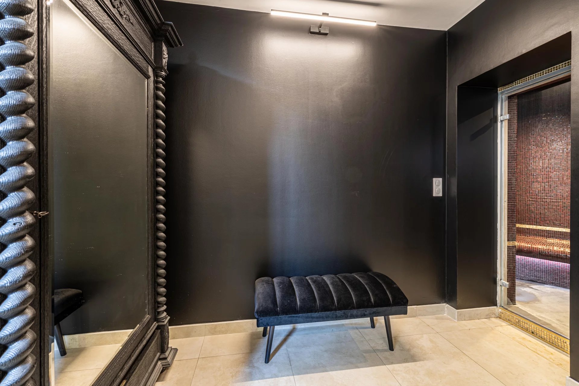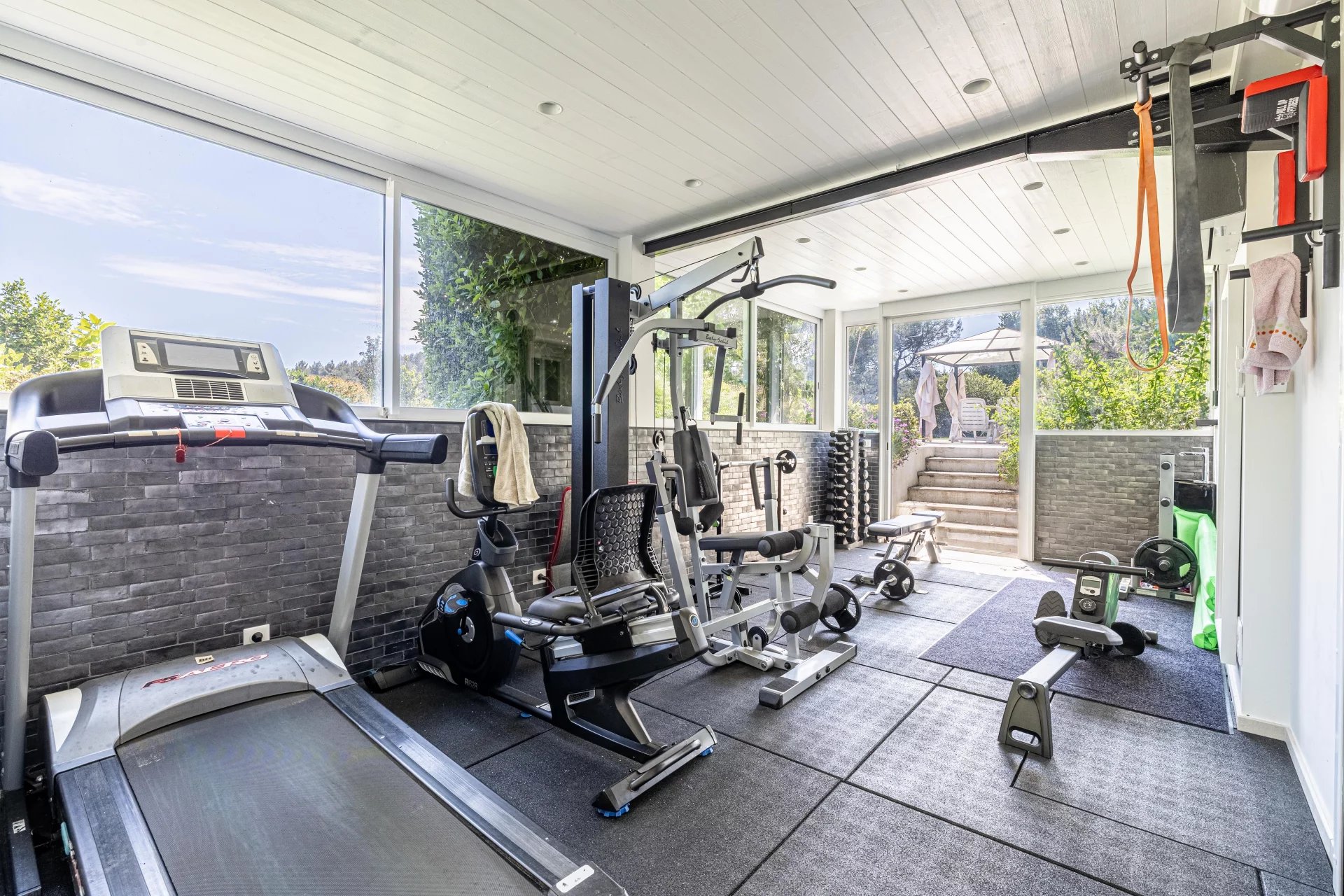 The main house spans approx. 465 m2 across three split levels, designed to enhance space, flow, and natural light. It features a spacious living room with stone fireplace, a cosy second lounge, a dining room, a fully equipped kitchen with pantry and veranda dining area, as well as a large office, a mezzanine, a cinema room opening onto the terrace, and a fully equipped gym with sauna and hammam. The 36 m2 master suite includes a walk-in closet, bathroom, separate WC and access to a private terrace with jacuzzi. Three bedrooms share a bathroom and a shower room, while two additional bedrooms have en-suite facilities.