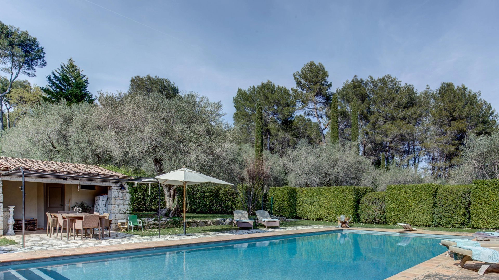 Outside, charm immediately works: an elegant pool area with a pool house, complemented by sunny terraces, fits perfectly into this green setting. Absolute tranquility, an unobstructed view of the surrounding nature, and the quality of amenities give this place a decidedly exclusive atmosphere.