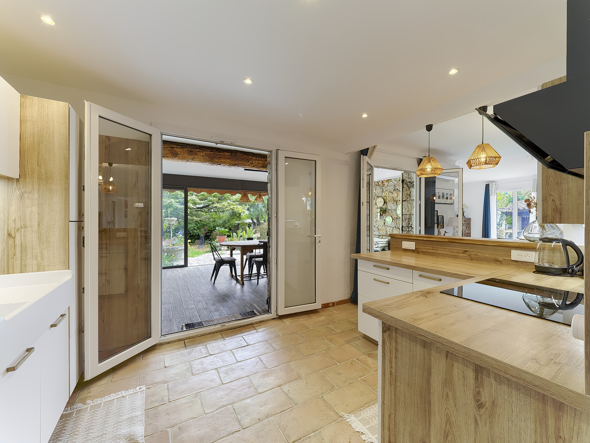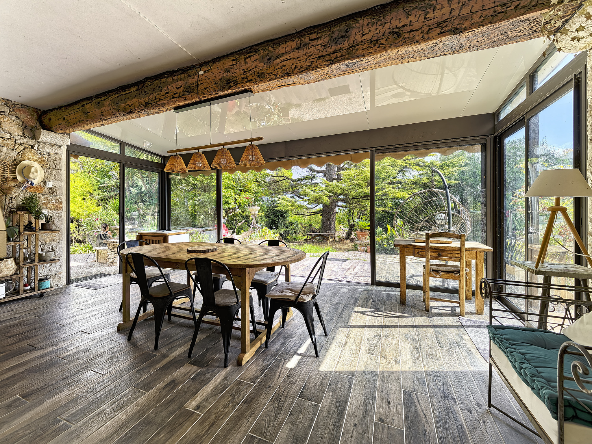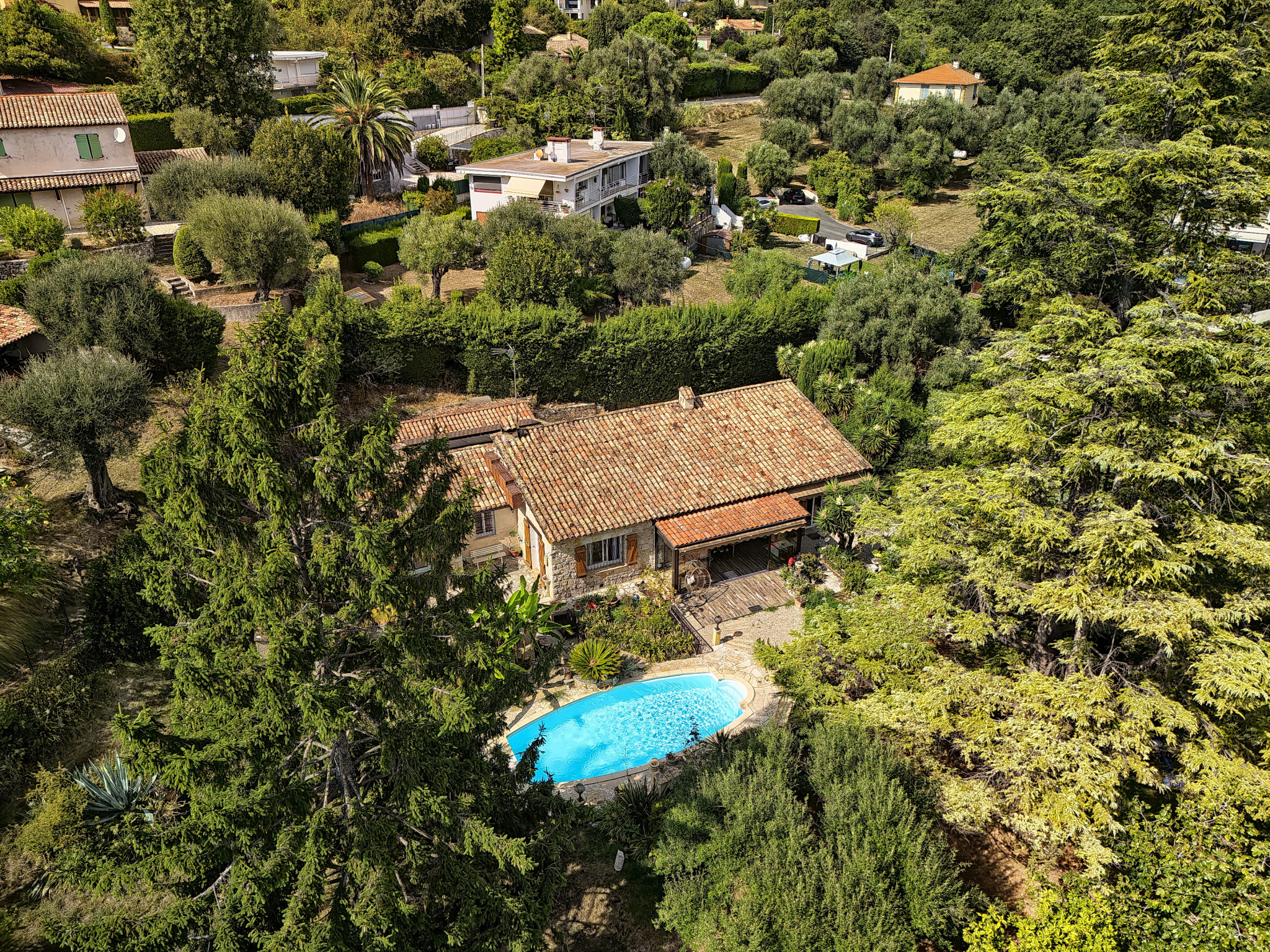Located in a peaceful residential area just minutes from the historic center of Vence and all amenities, this elegant single-level stone villa combines Provençal charm with modern comforts. Set on a beautifully landscaped 2,189 m² plot with majestic trees and Mediterranean essences, the property enjoys a privileged south/south-west exposure.