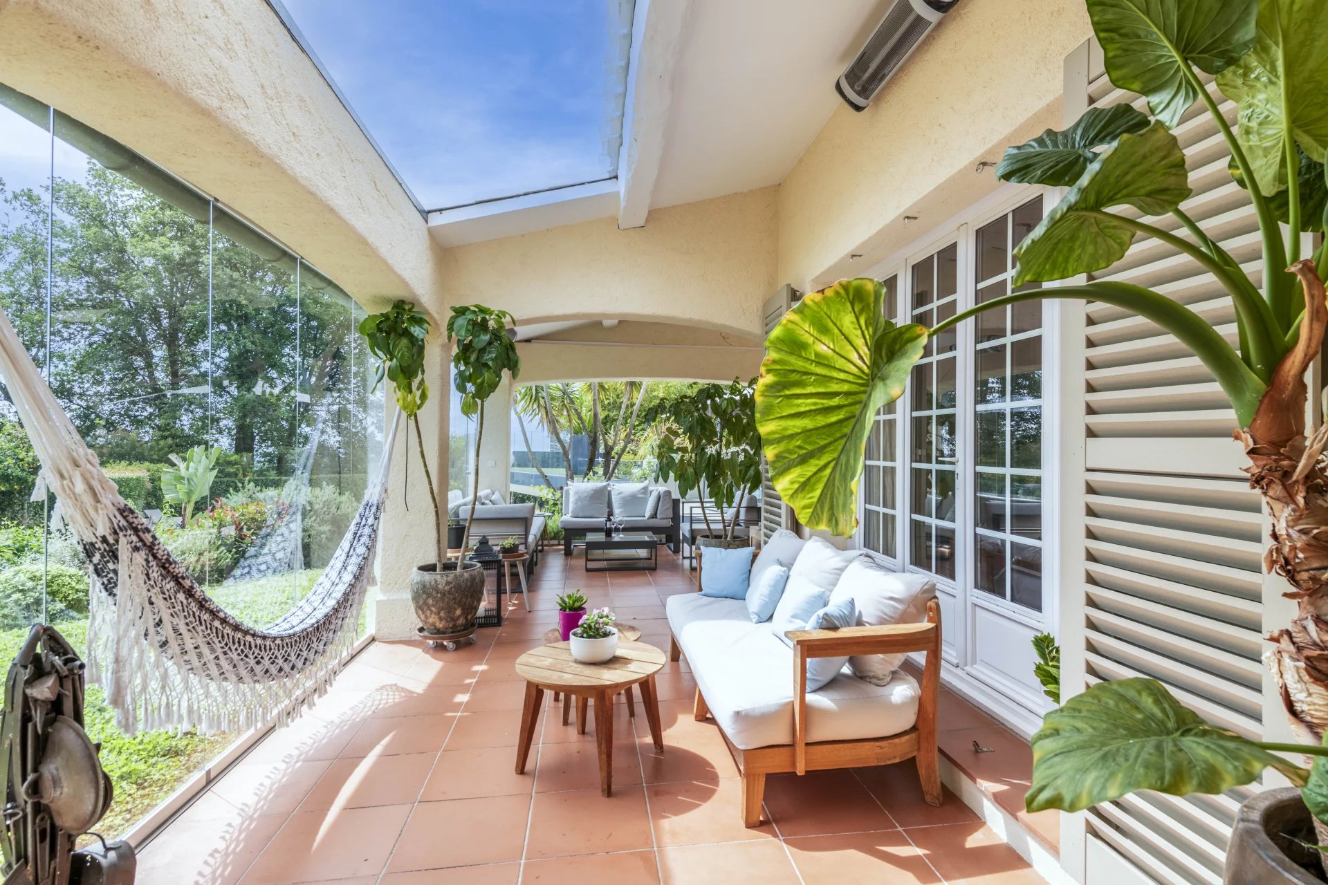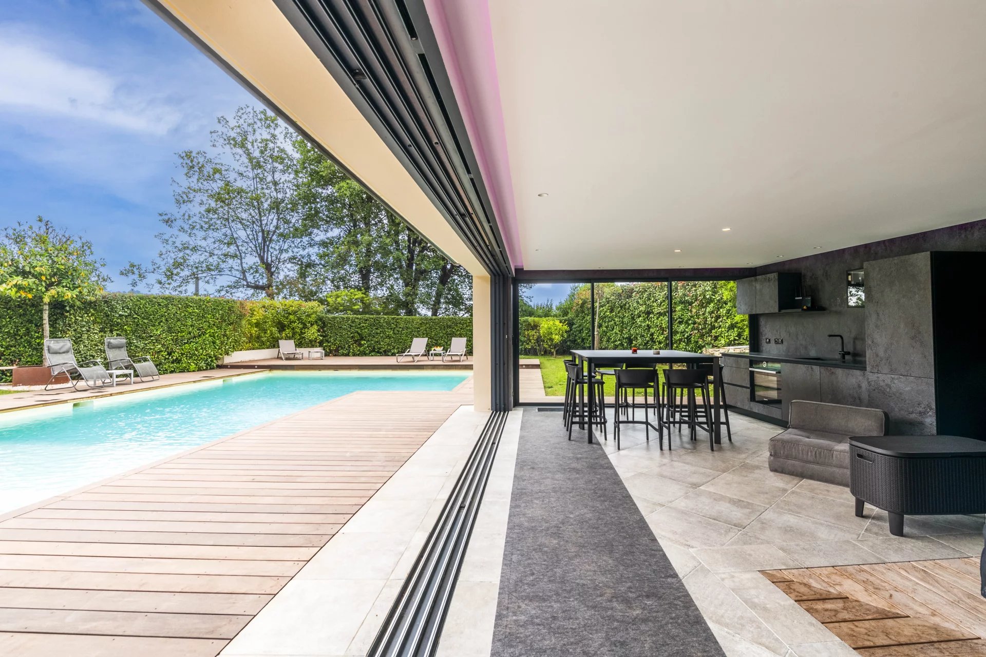 Inside, a bright entrance leads to spacious living areas filled with natural light, including a welcoming open kitchen, a dining room, a living room with a fireplace opening onto an elegant lounge area with sliding glass panels that transform the space into a terrace in summer.