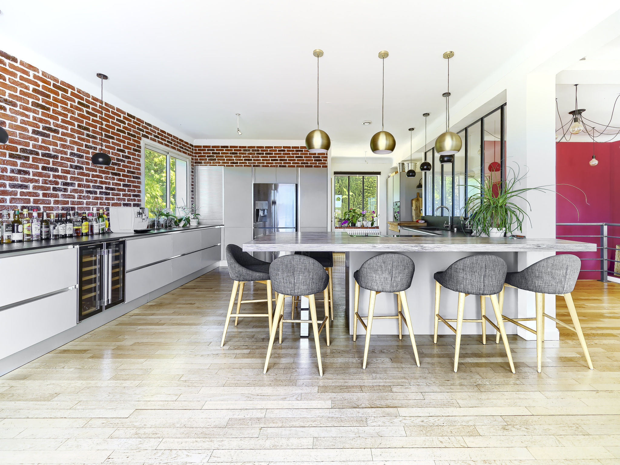 Elegant entrance hall leading to a spacious living room and a vast, fully fitted open-plan kitchen, both opening onto a sunlit terrace with sweeping views