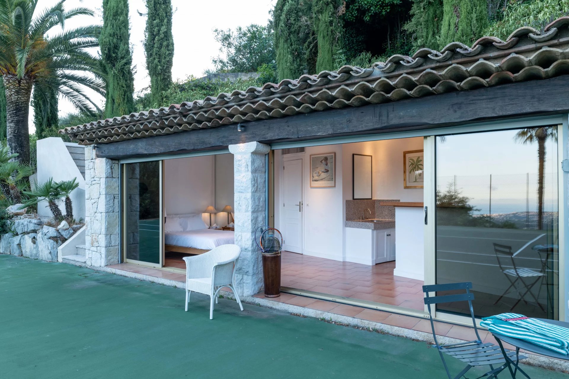 With a living area of almost 500 m2, the main villa features 13 bright rooms, offering generous and elegant living spaces. The light-filled living room opens onto a vast terrace with a breathtaking view of the Mediterranean Sea. Each of the 5 spacious bedrooms has its own bathroom, ensuring comfort and tranquility.