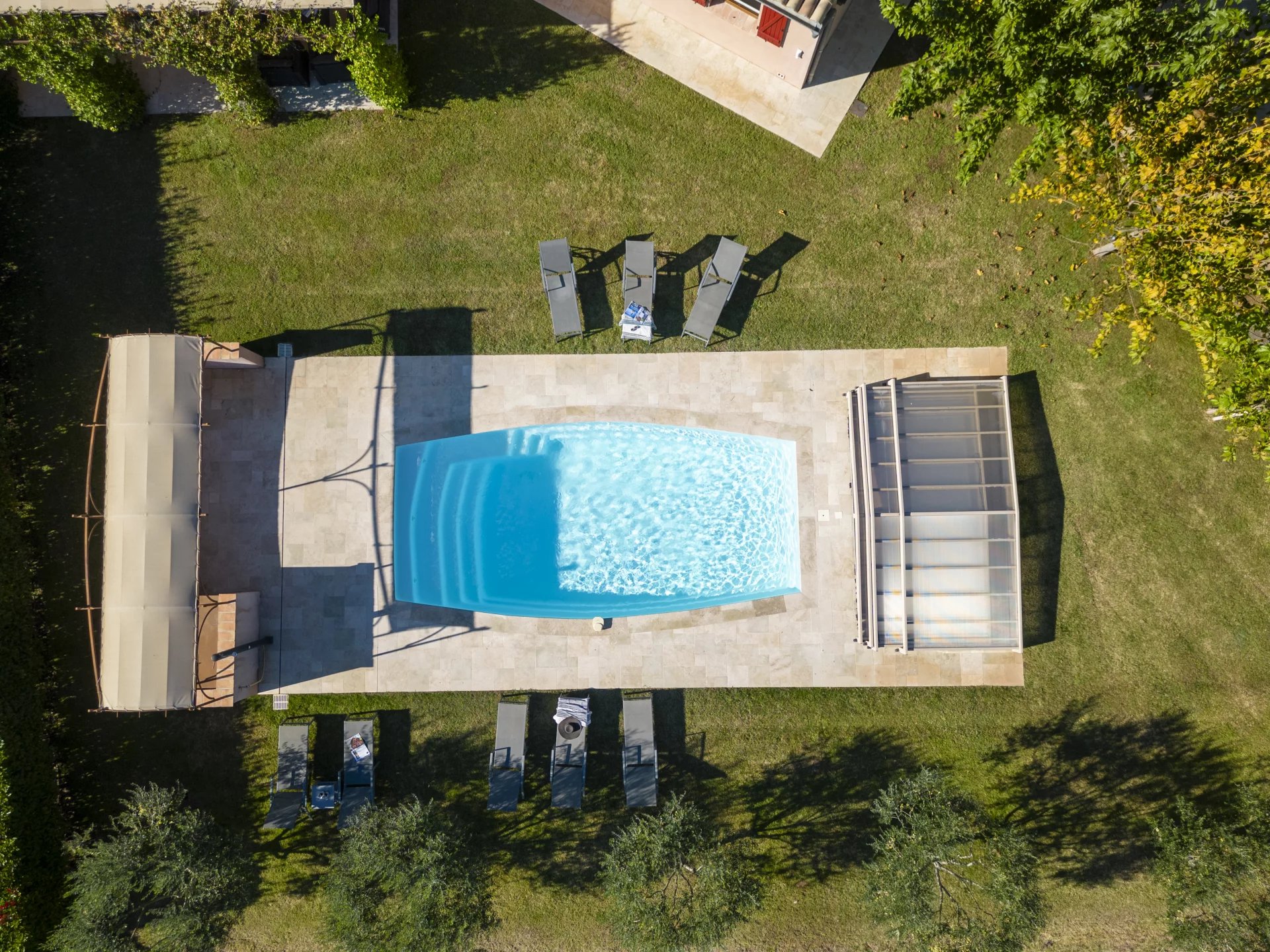 Outdoors, the setting is ideal for relaxation : a swimming pool with a clear and relaxing view of the surrounding nature, a petanque court, and a large tarred parking area.