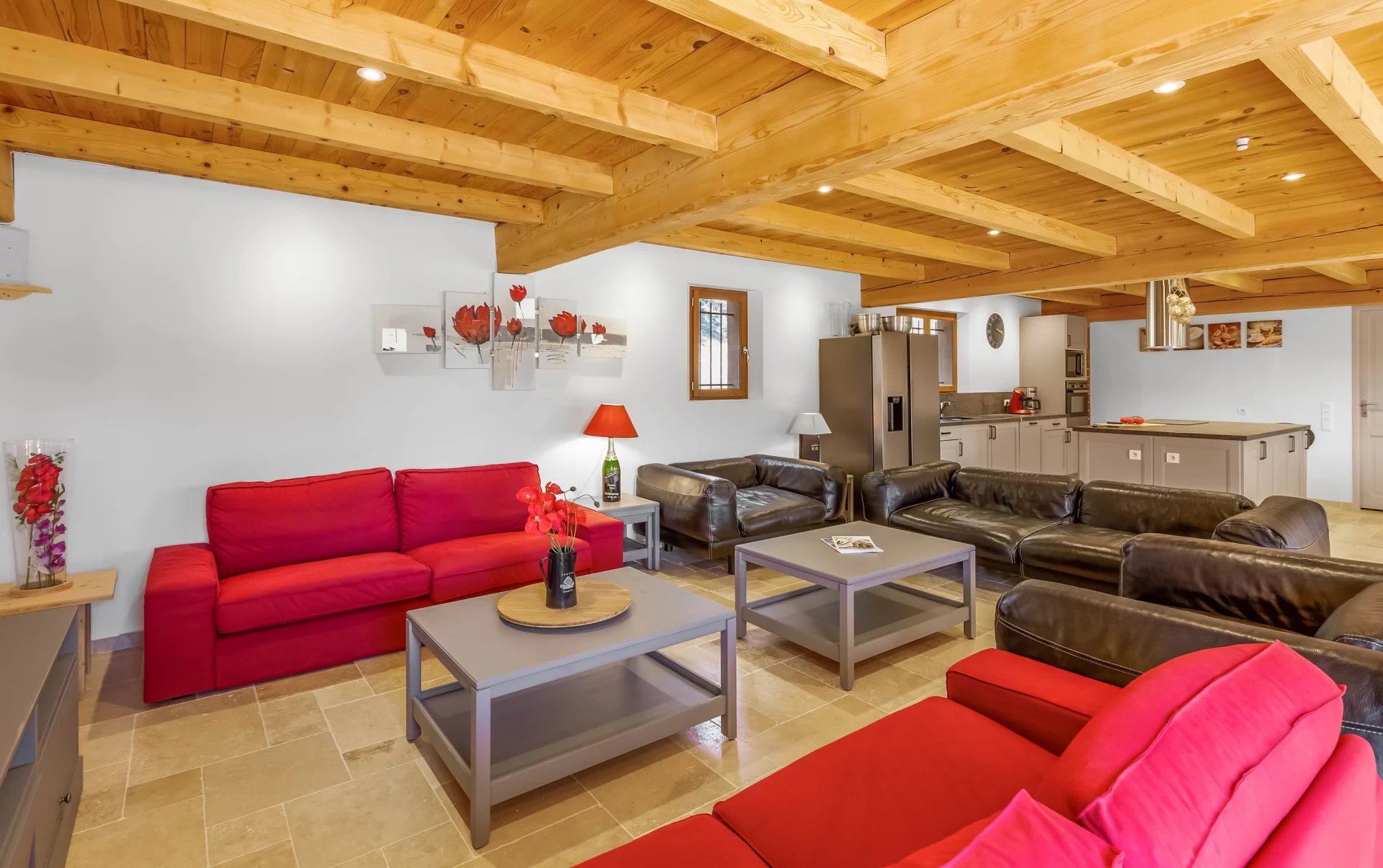 The entrance opens onto a bright and spacious living area comprising a large lounge, a dining space, and a fully equipped open kitchen, all overlooking a pleasant shaded terrace.