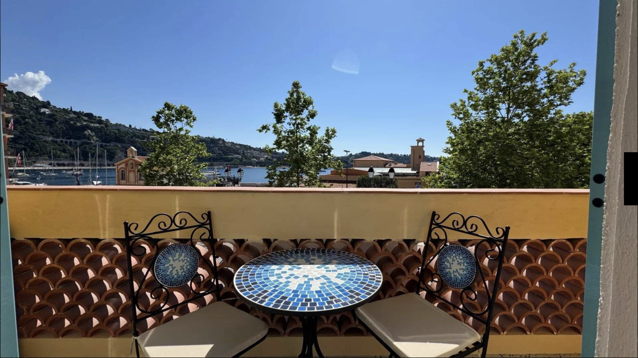 With an east/south exposure, the apartment is bathed in natural light, and four windows overlook the charming harbour of Villefranche. All exterior windows are aluminium, double-glazed, and complemented by new aluminium shutters. The entrance door is newly installed, crafted in wrought iron with secure glazing.