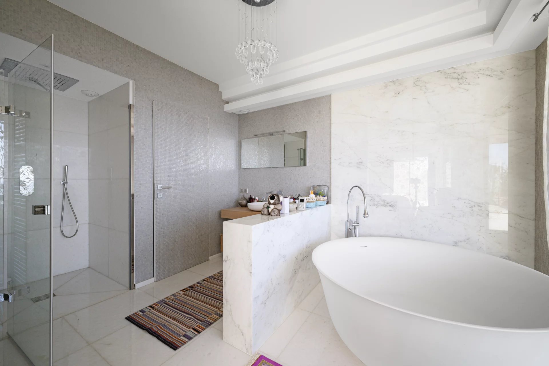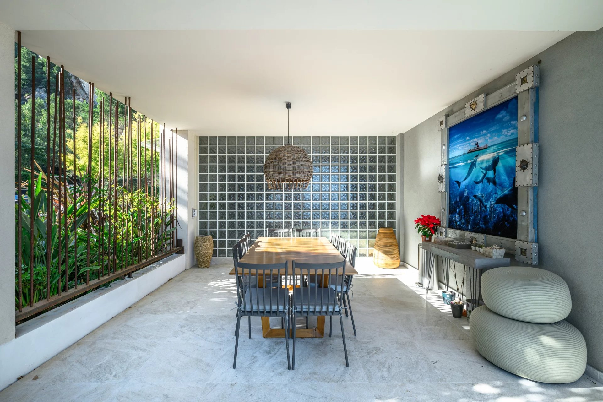 Upstairs, the villa offers four bedrooms, each with its own en-suite bathroom and large terraces with panoramic views. A completely independent studio, located at the garage level, serves as both a guest house and a fifth bedroom, providing additional space for visitors in complete privacy.