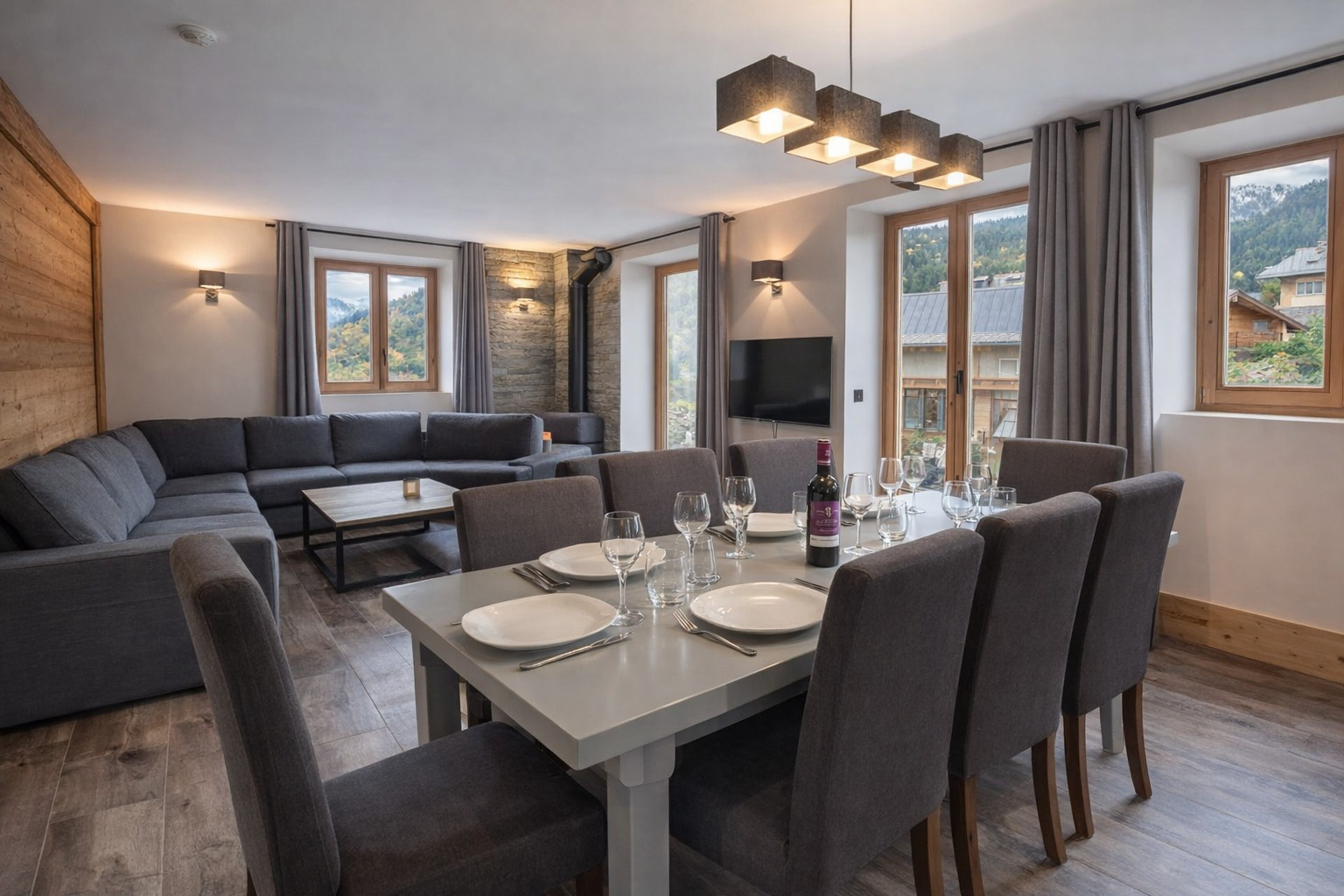 Located in the charming village of Les Allues, within walking distance of shops and the shuttle bus stop, come and discover this property comprising three apartments in two semi-detached houses, accommodating up to 18 people in total. This property has 275.36sq.m of living space and a total floor area of 352.9sq.m. The first house, which has been completely renovated, has a ski room, cellar, WC and utility/laundry room on the ground floor. Upstairs, the living room with open-plan kitchen opens onto a beautiful south-facing terrace. On the upper floor, you will find 2 bedrooms with a bathroom. On the top floor, 2 more bedrooms share a bathroom. Two covered parking spaces complete this property. The second house has two apartments: – A three-room flat with one bathroom – A four-room flat with two bathrooms. Two outdoor parking spaces are sold with this property.