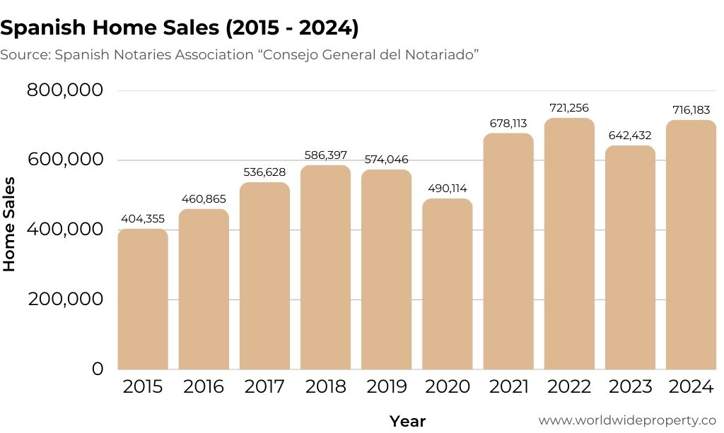 Spain’s real estate market had a strong year in 2024, with 716,183 home sales, marking an 11% increase from 2023 and 23% above the ten-year average. The fourth quarter alone saw a 17% rise, reflecting growing confidence in the market and heightened demand from both domestic and international buyers.