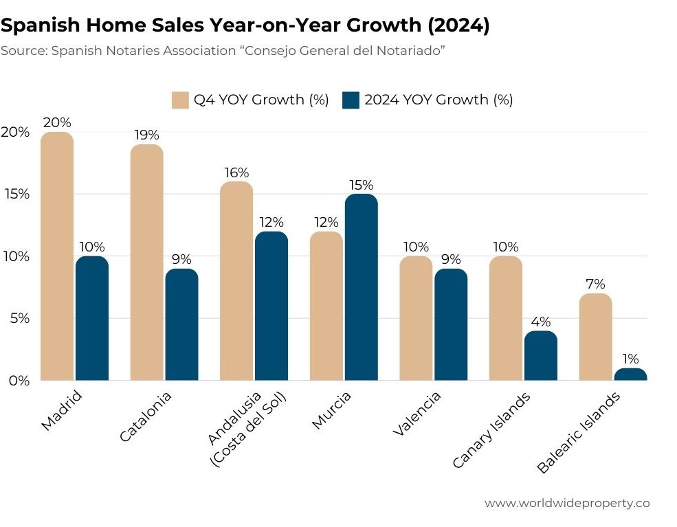 Balearic Islands: Despite its exclusivity, the Balearics recorded 7% Q4 growth but only 1% annual growth, reflecting high property prices. Demand remains strong in Ibiza, Mallorca, and Menorca, particularly for high-end homes and investment properties.